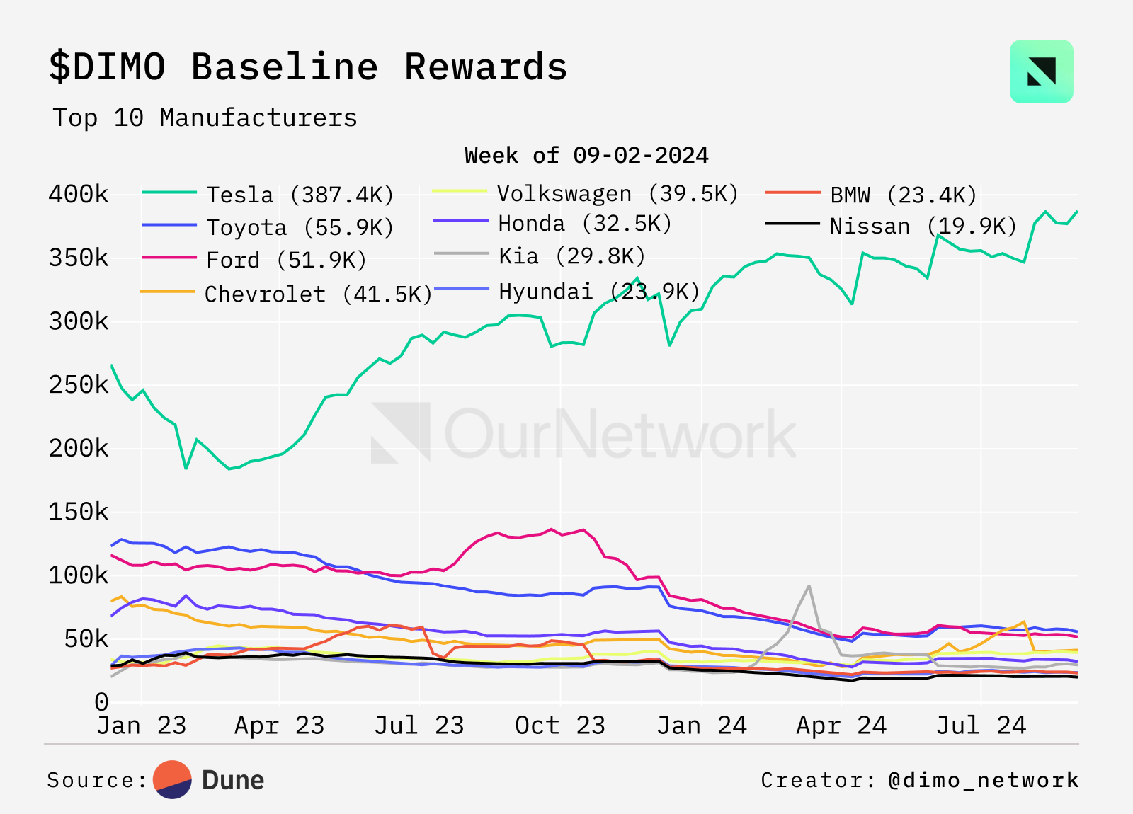 - DIMO's rewards highlight Tesla's dominance: a peak weekly issuance of 353K tokens to 4.1K users. Economy brands like Kia and Chevrolet perform well, while niche & luxury brands have consistent participation. This pattern indicates a growing ecosystem across many vehicle segments within the platform.