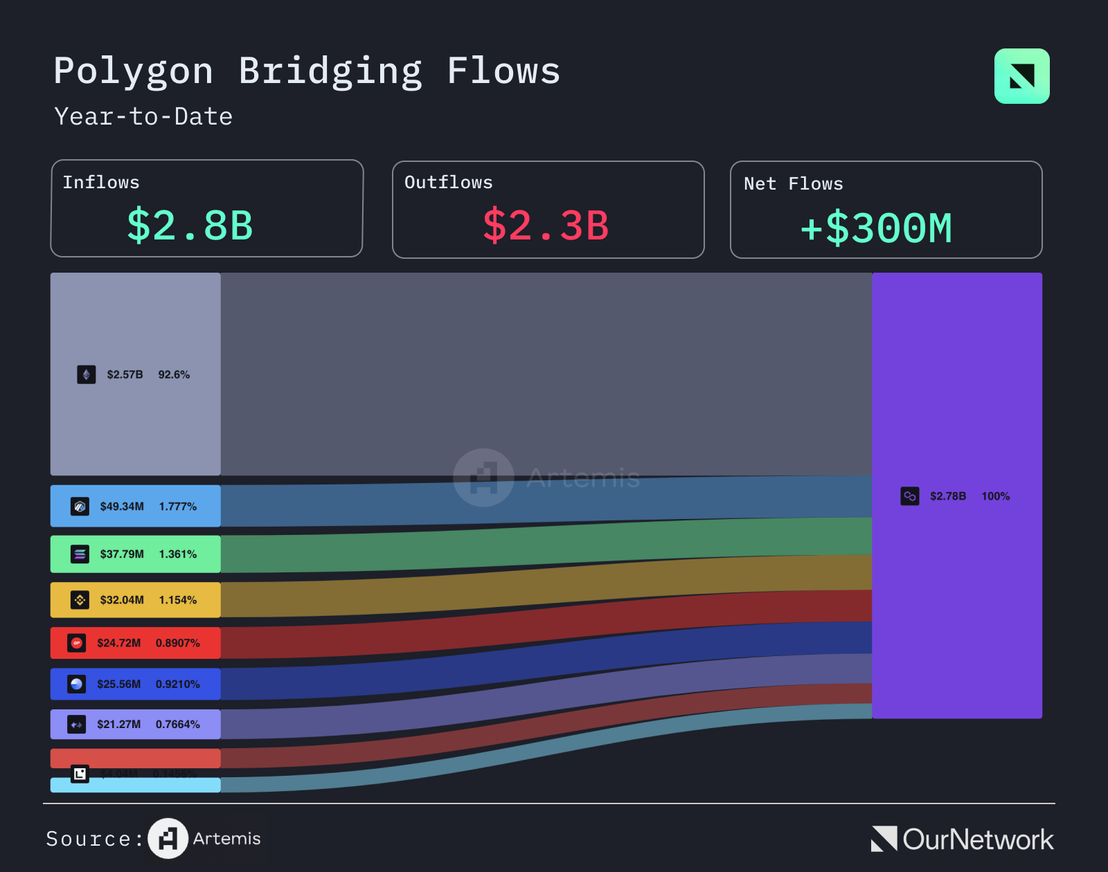 - Polygon has attracted $2.8B of inflows to its chain year-to-date, with 92% ($2.57M) coming from Ethereum mainnet, 1.77% from Arbitrum ($49.34M), and 1.36% ($37.79M) from Solana. The chain experienced $2.5B in outflows which bring year-to-date net inflows to Polygon to +$300M. These net positive inflows over an extended period of time are a strong indicator of real demand for the services in the Polygon ecosystem.