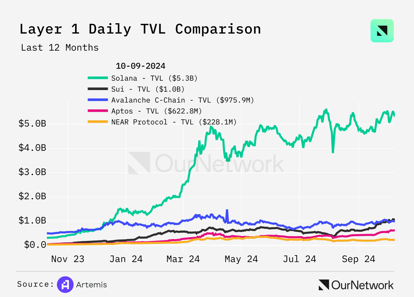 - Aptos is another high performance blockchain which uses the Move programming language. Since the start of 2024, Aptos' TVL has more than quadrupled—hitting a record high of $668M on Oct. 8—with contributions from Aries Markets, Amnis Finance, and Thala, all of which are DeFi protocols. Aptos also recently overtook Bitcoin mainnet as reach the 14th highest TVL across all chains as users grew 4x in 2024, skyrocketing to 26M total unique users. Additionally, during the week of Oct. 1, 1M+ new users joined the ecosystem as monthly actives creep to 5M. In the past week, Aptos processed 27M+ transactions—up 22% WoW—as total transactions near 2B.