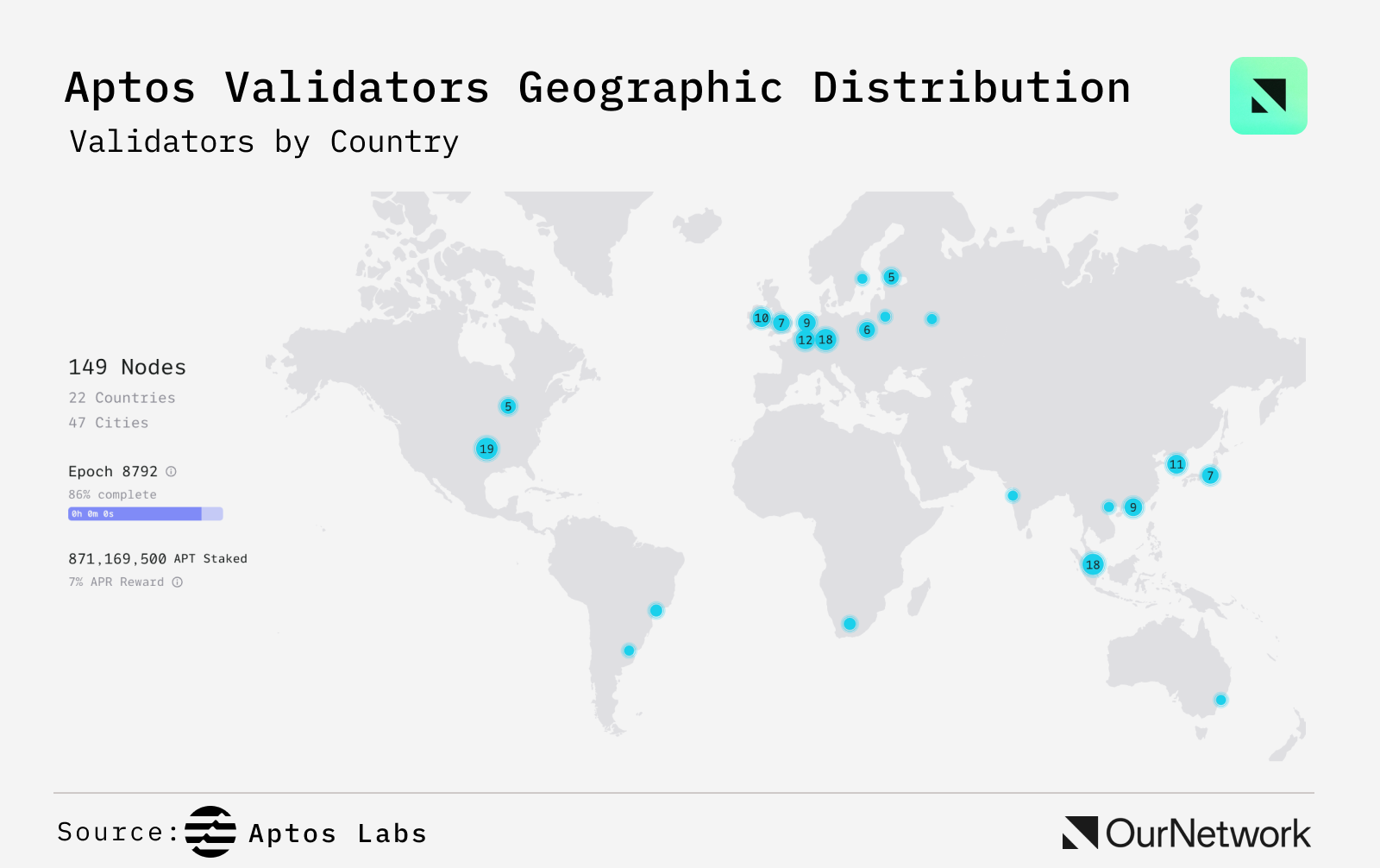 - With 78% of its native asset staked (871 million of 1.12 billion APT), a 7% staking rate, and 149 validators across 22 countries, Aptos is solidifying its role in DeFi. This global participation underscores the network’s strength and its broader ecosystem’s commitment to security and scalability in the DeFi space.