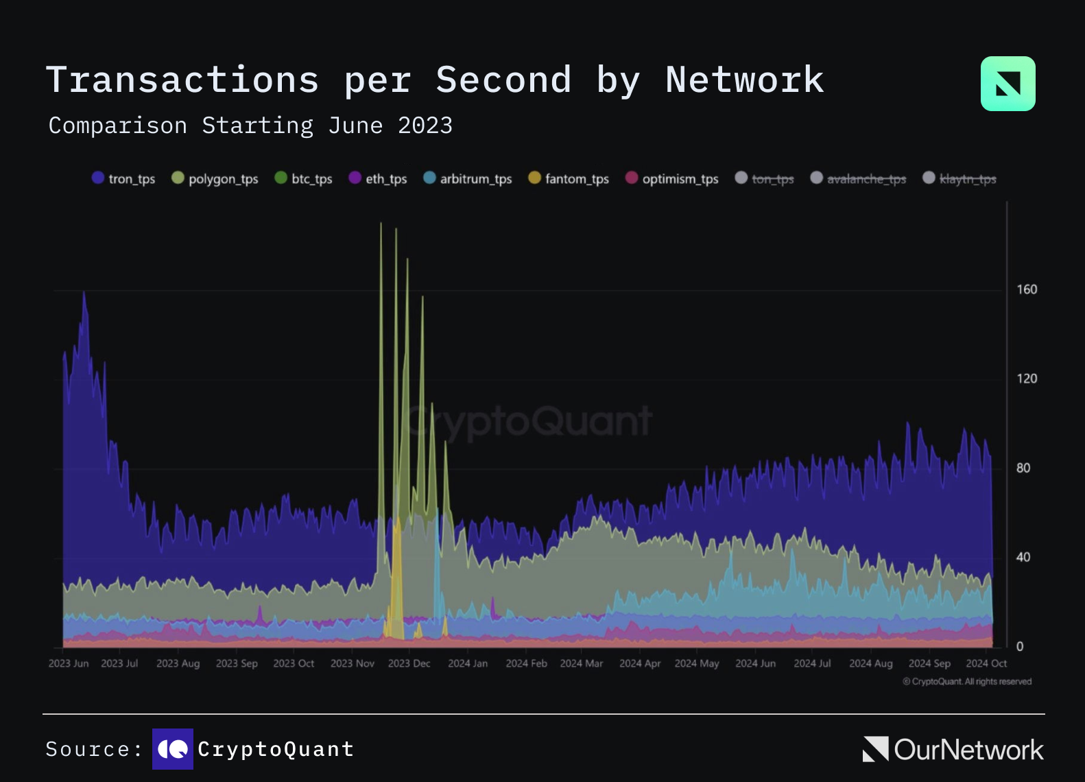 - According to @JA_Maartun on X, “TRON consistently processes the highest actual volume of txs over time, with a… rate of 85 TPS, surpassing its competitors: BTC (~7 TPS), ETH (~14 TPS), and Polygon (~30 TPS)... it's noticeable how reliable TRON's actual TPS remains compared to other chains.”