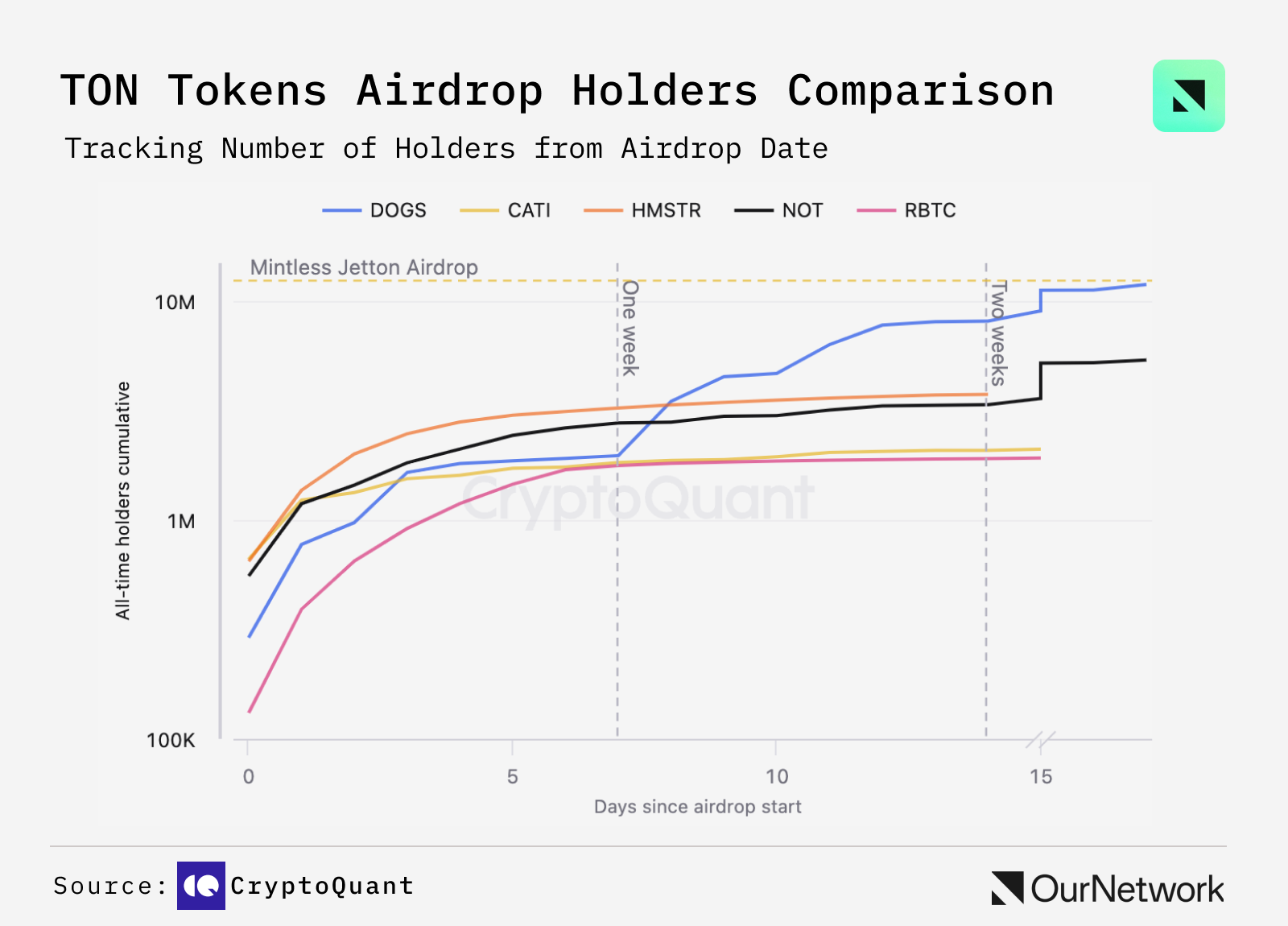 - During 2024, project leaders have launched significant tokens on TON — NOTCOIN in May, DOGS in August, CATI, RBTC and HMSTR in September. All these token were distributed as airdrops among the users of Telegram mini-apps, applications which run the messaging platform. Performing airdrops is a big challenge for every blockchain. Here, TON is showing excellent results with all tokens reaching over 1M holders less than a week since the initial airdrop.