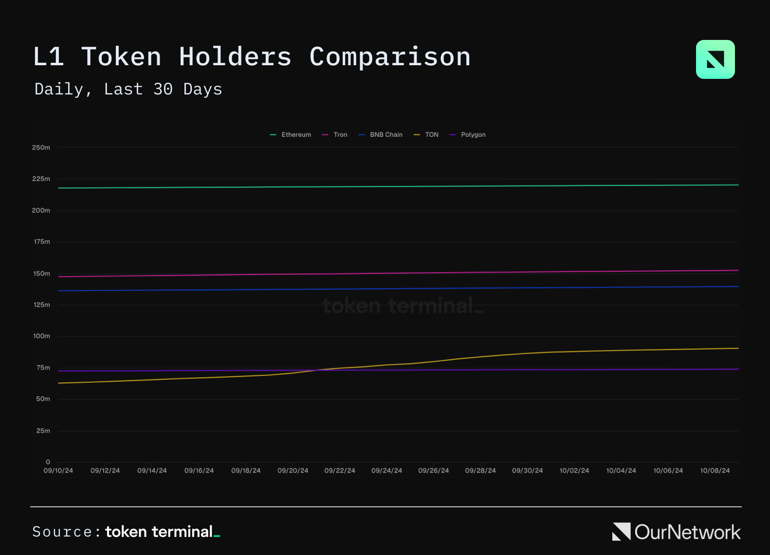 - TON is the fastest growing chain across all L1s. Last month TON surpassed Polygon in number of token holders (addresses with positive balance) and now TON is moving towards TRON and BNB.