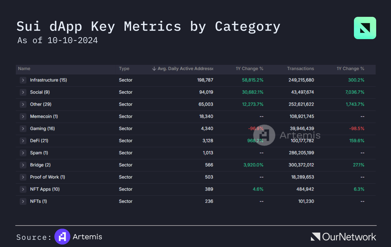 - The leading categories for dApps on Sui are infrastructure and social by a large margin. In general, Sui dApps have driven a 3,600% increase in daily active addresses year-over-year.