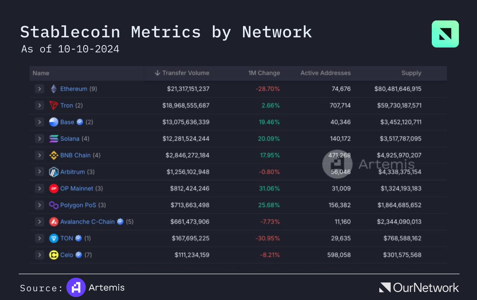 - Over 50% of USDT's total supply ($119B+) circulates on the TRON network, making it the first blockchain to host a single stablecoin valued at over $60B. Stablecoin transaction volume reached $453.8B, up 10.91% in the last 30 days, with 68.7M transactions—a 5.36% increase over the same period.