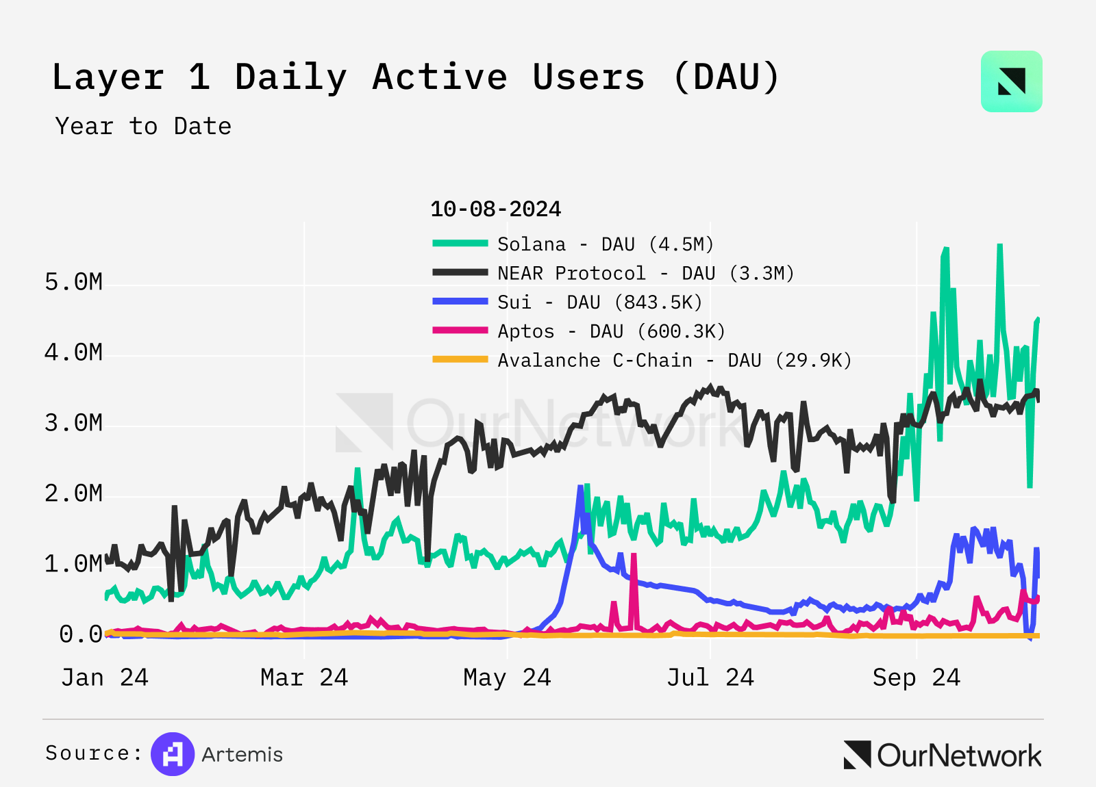 - As seen in the chart below, Sui experienced rapid growth in daily active users (DAU), from 19,758 on Jan. 1, 2024, to 843,450 by Oct. 8, 2024. That's a 4,169% increase, and the largest increase in DAUs across competing L1 chains.