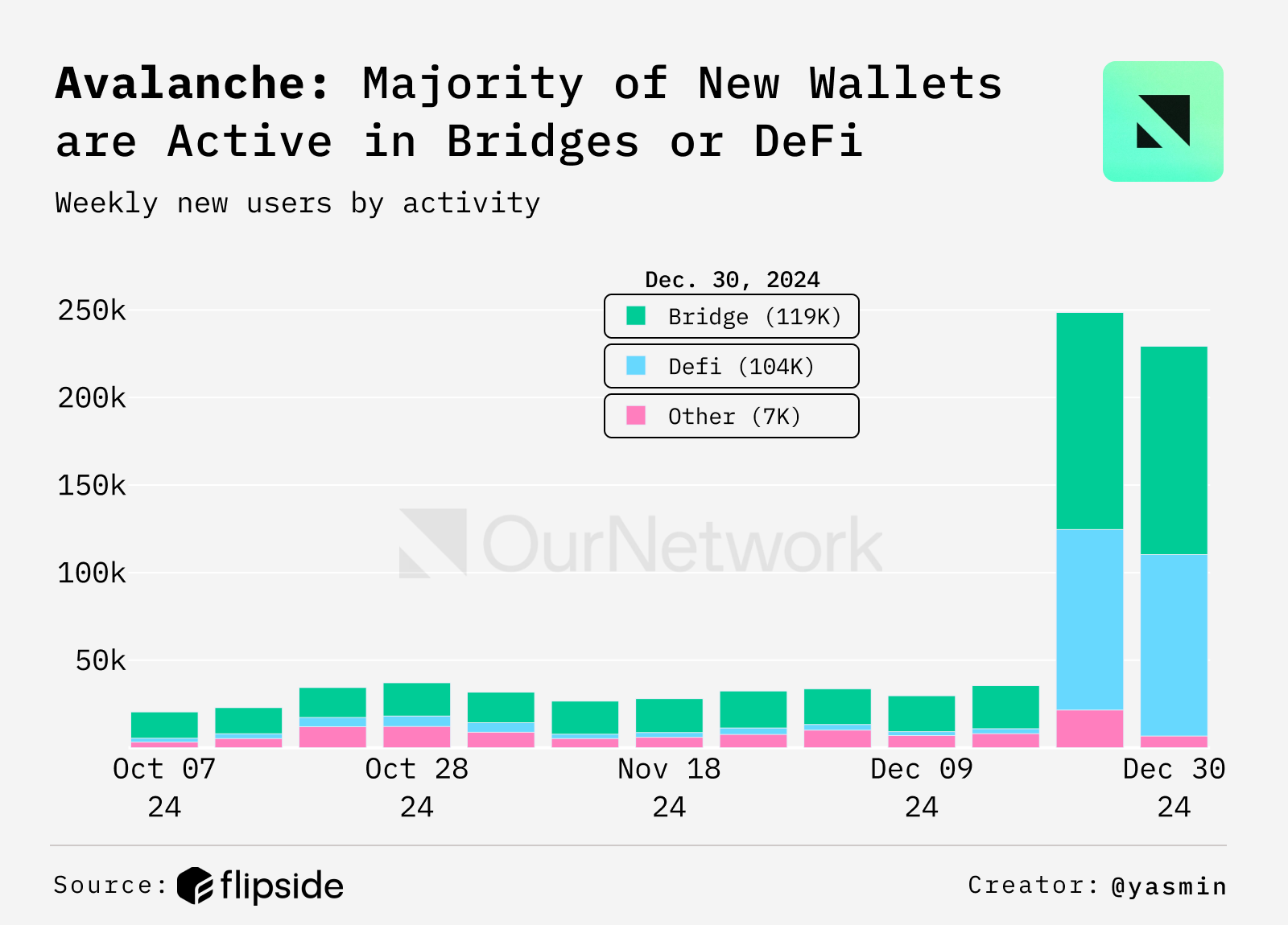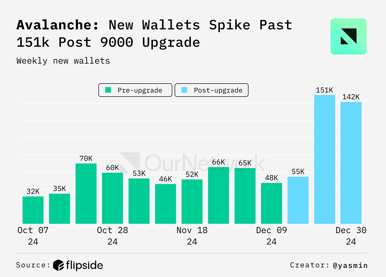 - Avalanche, an EVM compatible Layer 1 blockchain, launched its Avalanche 9000 upgrade on Dec. 16 2024, dropping gas fees by 90%. The cost efficiency is already showing its impact β new user onboarding has spiked significantly, reaching ~150,000 new wallets in the first weeks post-upgrade, nearly matching the network's previous all-time highs from mid-2023.