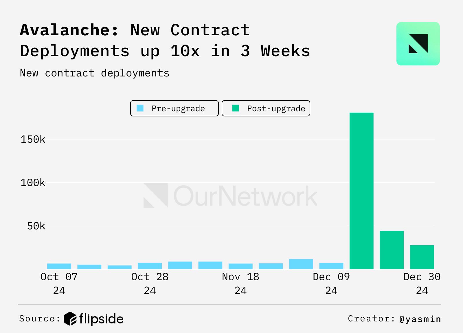 - In the three weeks following the upgrade, a total of 252,925 contracts were deployed β nearly a 10x increase compared to the 26,123 contracts deployed in the three weeks prior. This leap boosts developer confidence and accelerates innovation in the Avalanche ecosystem.