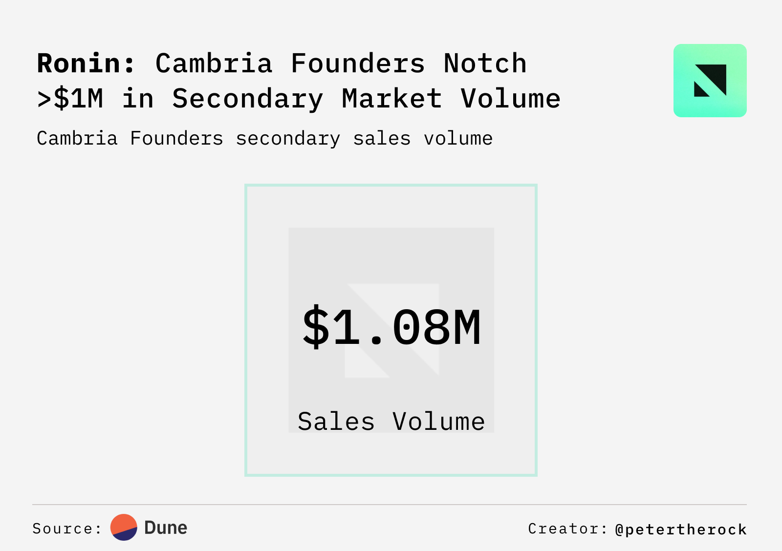- Cambria is an experimental MMO game with real stakes and onchain significance, pioneering the "Risk-to-Earn" model. Its assets, Founders & Cores, have amassed $1.8M in secondary sales, with Cores generating $723K in primary sales. Cambria's previous version saw 62.4K ETH wagered & will continue on Ronin.