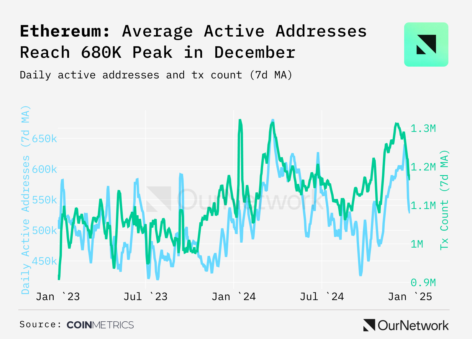 - Activity on Ethereum mainnet, the most valuable smart contract platform with a market capitalization of $440B, trended higher in March 2024 spurred by marketwide growth, with daily active addresses and transaction counts rising to 680K and 1.3M respectively. While activity tapered down in the summer after the Dencun upgrade βalso in March 2024β it has since rebounded, supported by the Layer 2 ecosystem as markets heat up once again, illustrating the reflexive nature of blockspace demand on Ethereum.