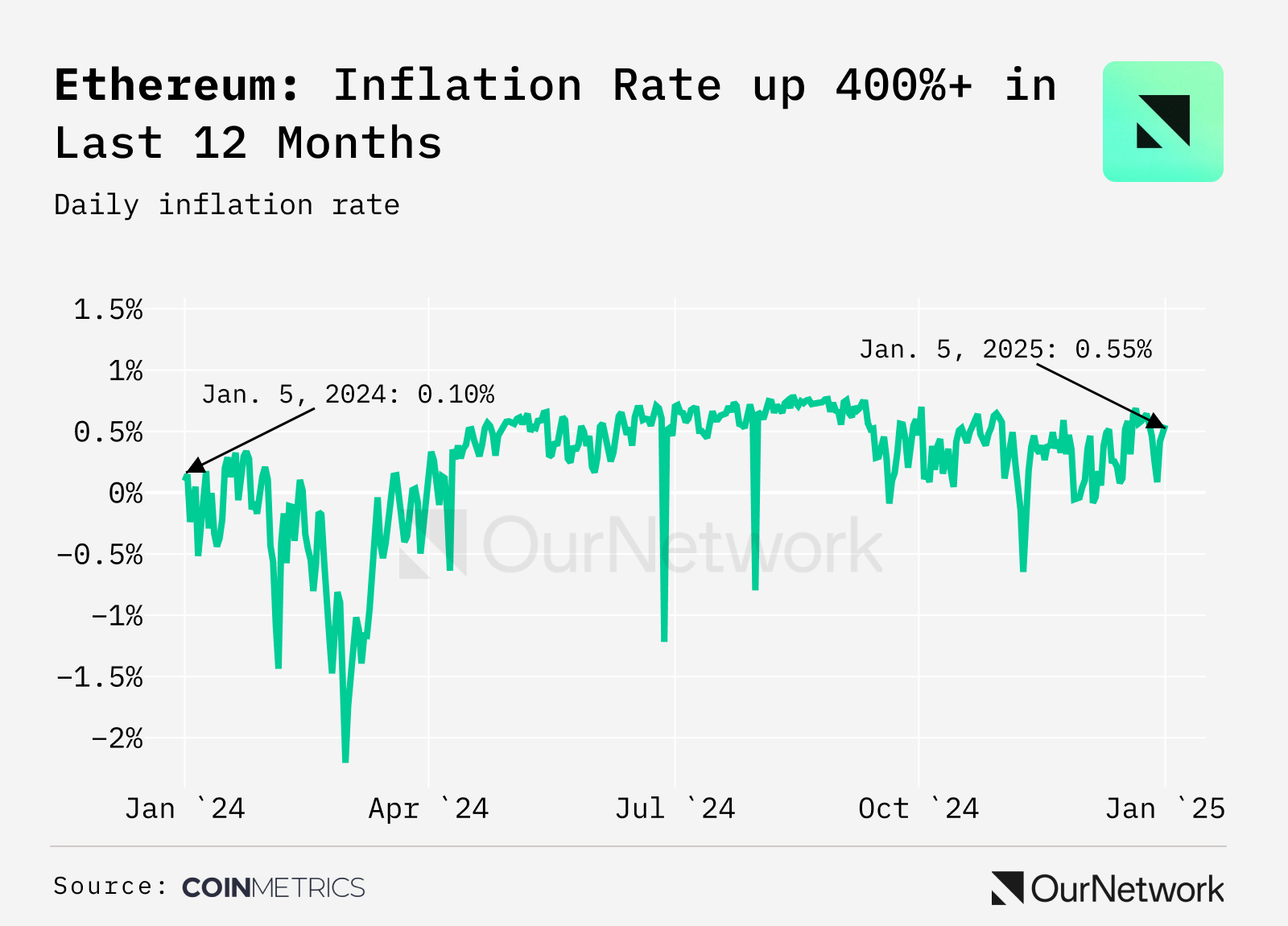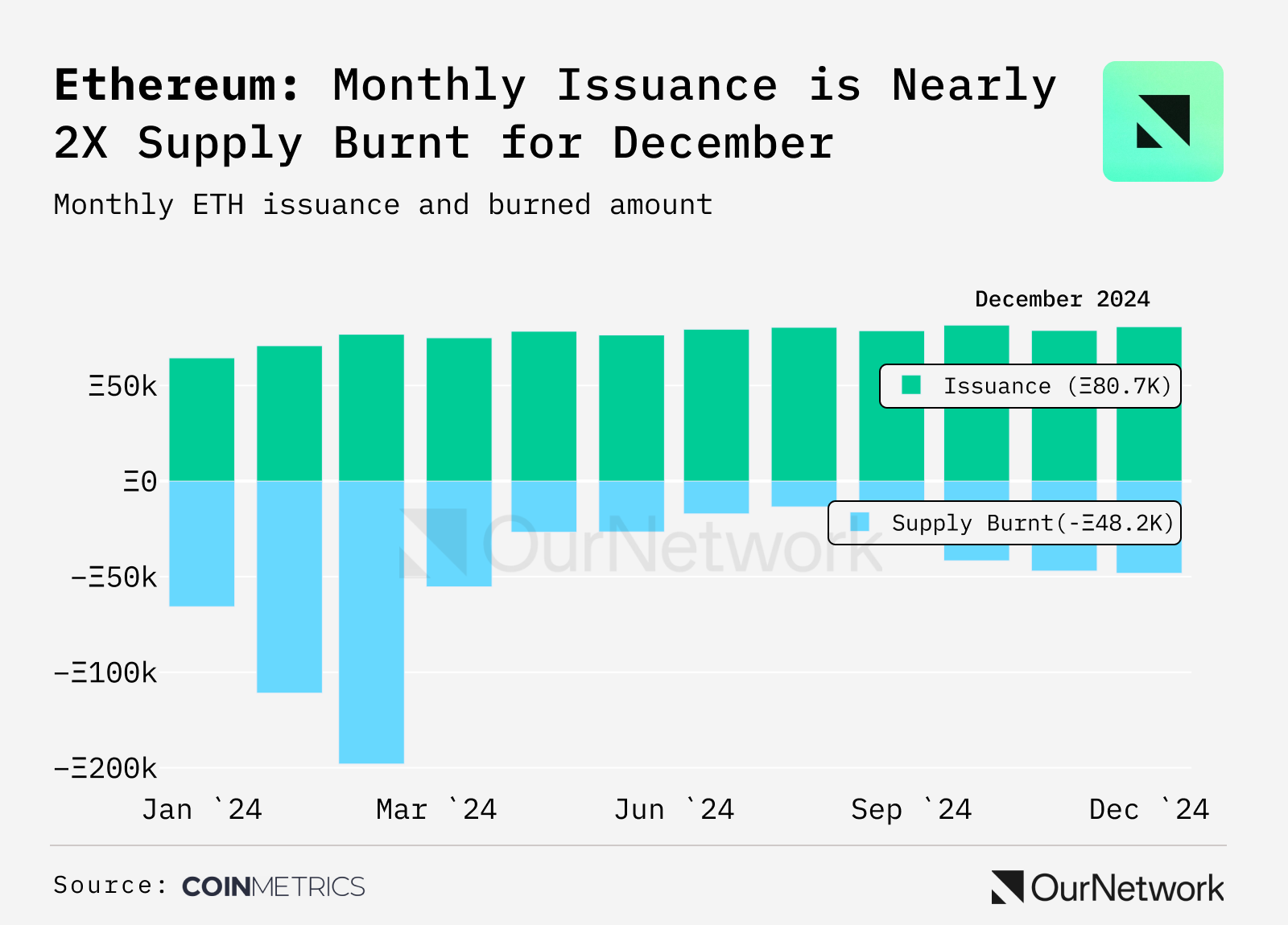 - Ethereumβs inflation rate, tied to blockspace demand, stands at 0.5% as total issuance (78K) exceeded ETH burned (47K) in 2024. ETH continues to be exported, with over 3M tokens bridged to Base, Arbitrum, and other Layer 2s, as the upcoming Pectra upgrade scales blob capacity and grows blockspace secured by ETH.