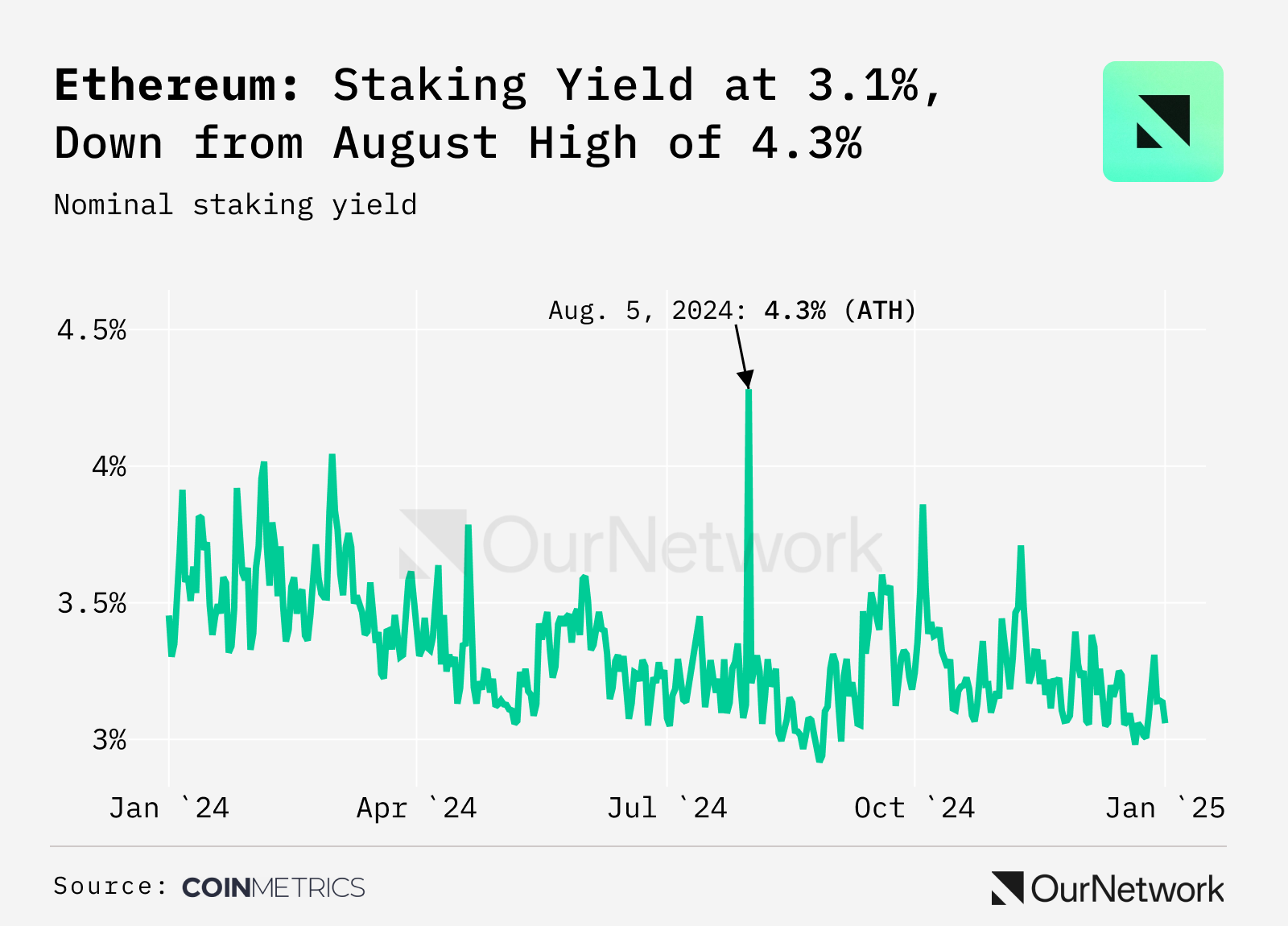 - A 3.1% nominal staking yield (2.6% inflation-adjusted) presents an attractive proposition, incentivizing validators and institutions alike. Prospects of a staked Ether ETF, rising blobspace demand could drive deflationary ETH supply and strong on-chain growth in 2025.