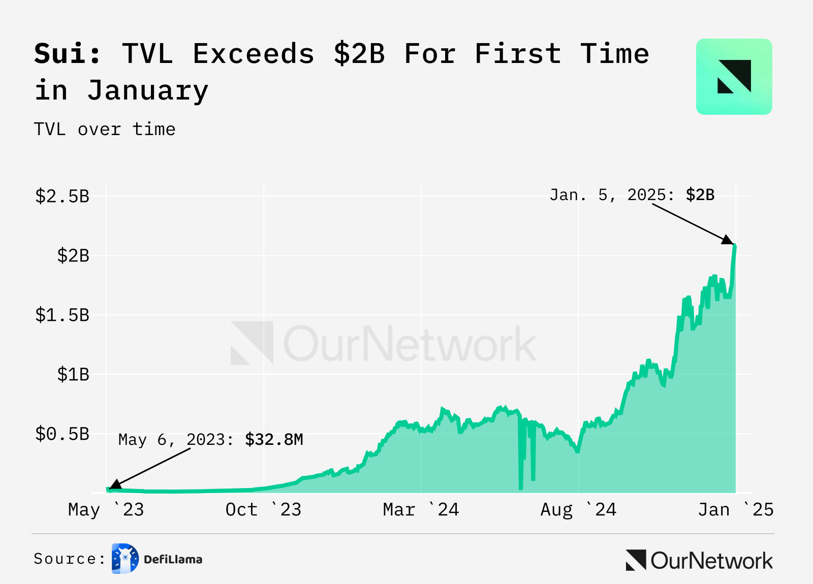 - DeFi on Sui, a high-throughput Layer 1, was in the spotlight from the beginning of 2024. Two key projects in the space, Scallop and Navi, used incentivized pools to help pioneer DeFi season on Sui by deepening liquidity and distributing rewards for users. Sui TVL had increased from $220M to $2B since the start of 2024. Net inflows remained in the top 5 all year, with only 11 days of outflows over the last 30 days. The SUI token's price has also exploded, starting the year at $0.80 and ending the year at $5.14 (+540%).