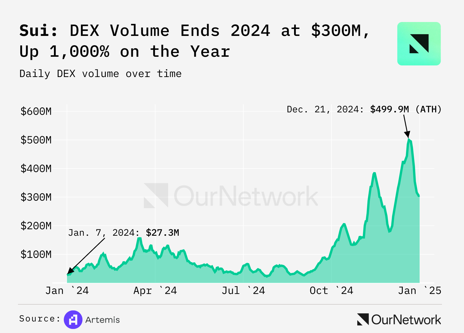 - Sui's decentralized exchanges experienced huge growth, beginning the year with a combined 37,000 daily users and $27M volume and ending the year with over 600,000 active users and $300M daily volume. TVL and volume on Cetus, the preeminent automated market maker (AMM) on Sui, both increased by a factor of 10+ during 2024.