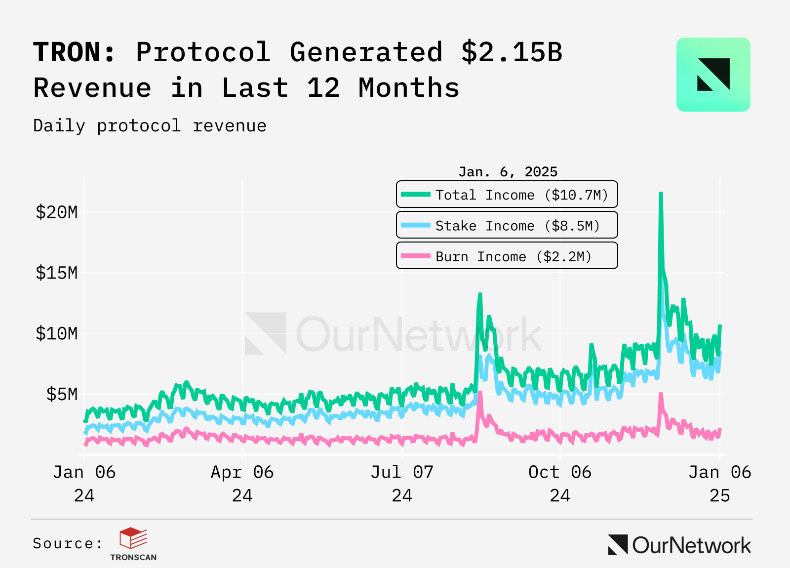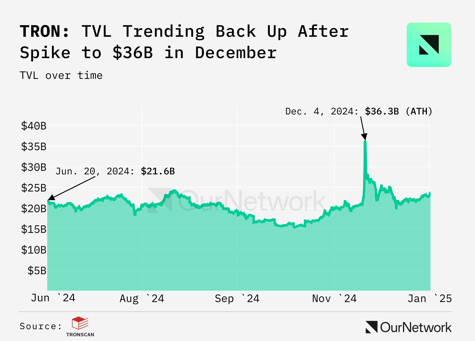 - TVL on TRON, another major Layer 1, has surged past $23.4B. Over the past 30 days, there were 2.62M+ daily active accounts and 174K new accounts recorded per day on average. Over the past 30 days, the TRON blockchain network has generated $304.54M in total protocol revenue. Over the past 365 days, it has achieved $2.15B in revenue, representing a growth of over 116.38%.