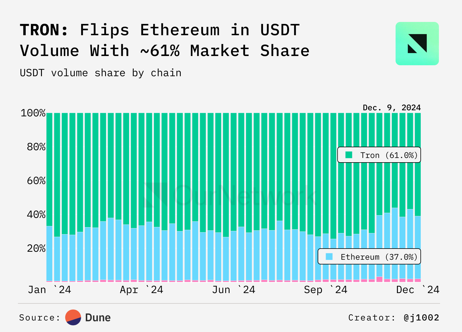 - Over 60% of USDT volume occurs consistently on TRON. The T3 Financial Crime Unit (T3 FCU), a collaboration between TRON, Tether, and TRM Labs, has frozen more than $100M in criminal assets globally, passing a significant milestone in its fight against cryptocurrency-related financial crime.