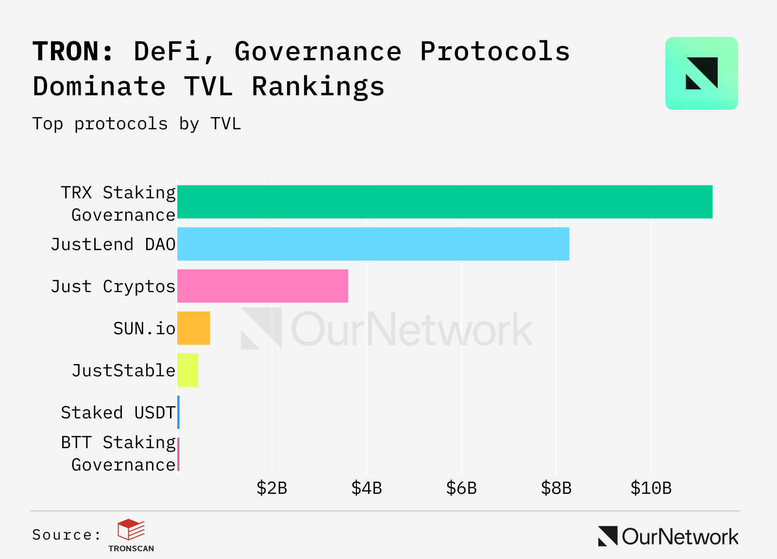 - Chainlink Data Feeds has become the official data oracle solution for the TRON blockchain ecosystem. Chainlink's industry-standard data oracles will help secure JustLend and JustStable, the two largest DeFi applications on TRON, which together represent over $9B in TVL as of January 2025.