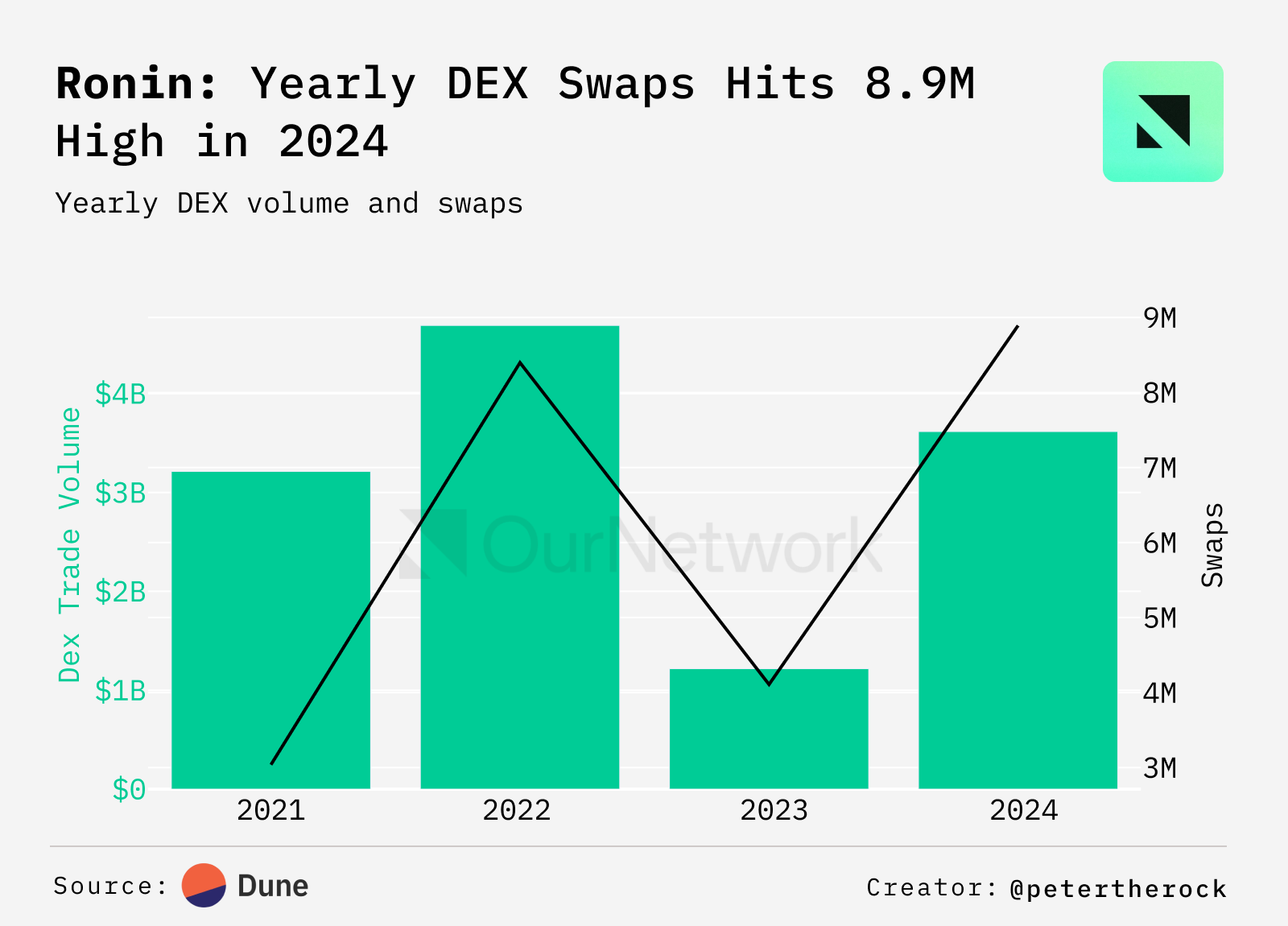 - Ronin is an EVM blockchain crafted for developers building games with player-owned economies. It attracted over 17M active wallets and faciliated 616M transactions over the last year, marking a 10x year-over-year growth. Network revenue also grew ~8x to 873K RON. While 2024's DEX volume is 22% lower than 2022's, the number of swaps increased 5%, from 8.4M to 8.9M within the same period. These numbers are projected to rise further as Ronin transitions to a permissionless chain in Q1 2025.