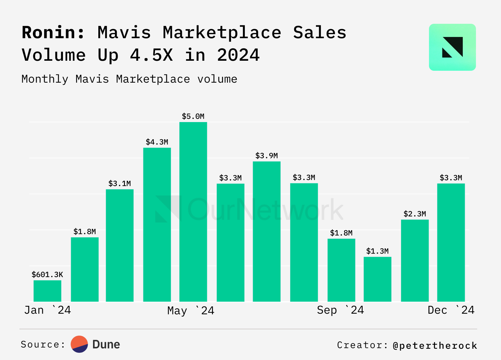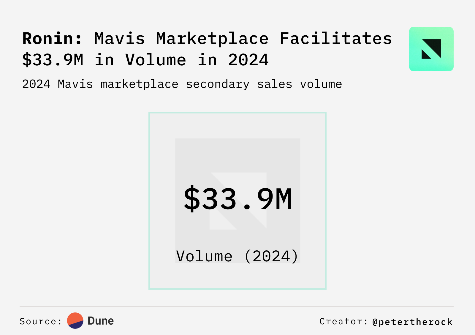 - In 2024, the Mavis Marketplace, an NFT marketplace built on Ronin, generated $33M in sales volume executed over almost 1.8M trades. At the heart of the Mavis Marketplace is a payment system, Mavis Pay, that streamlines the payment experience. Mavis Pay has processed over $4M in transaction volume over half of which was executed in May.