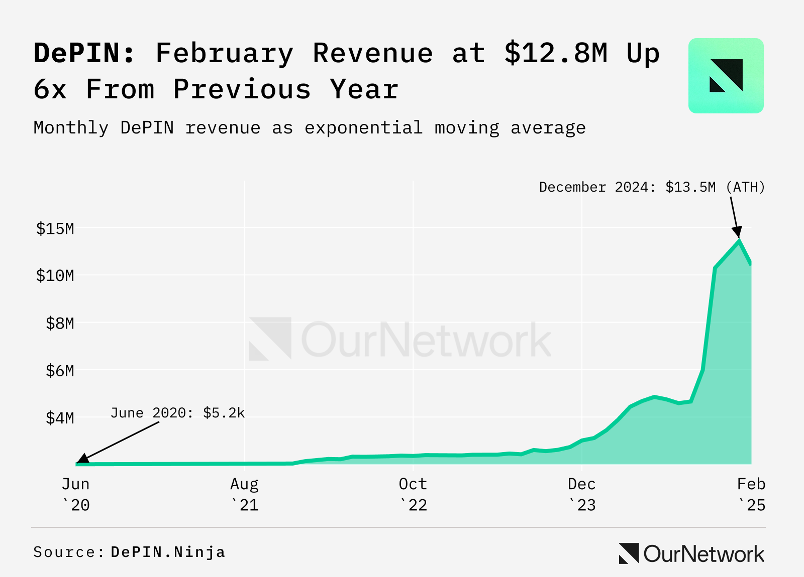 There's evidence that DePIN is poised for broader adoption — the sector’s revenue hit a high of $13.5M in December, according to DePIN.Ninja.