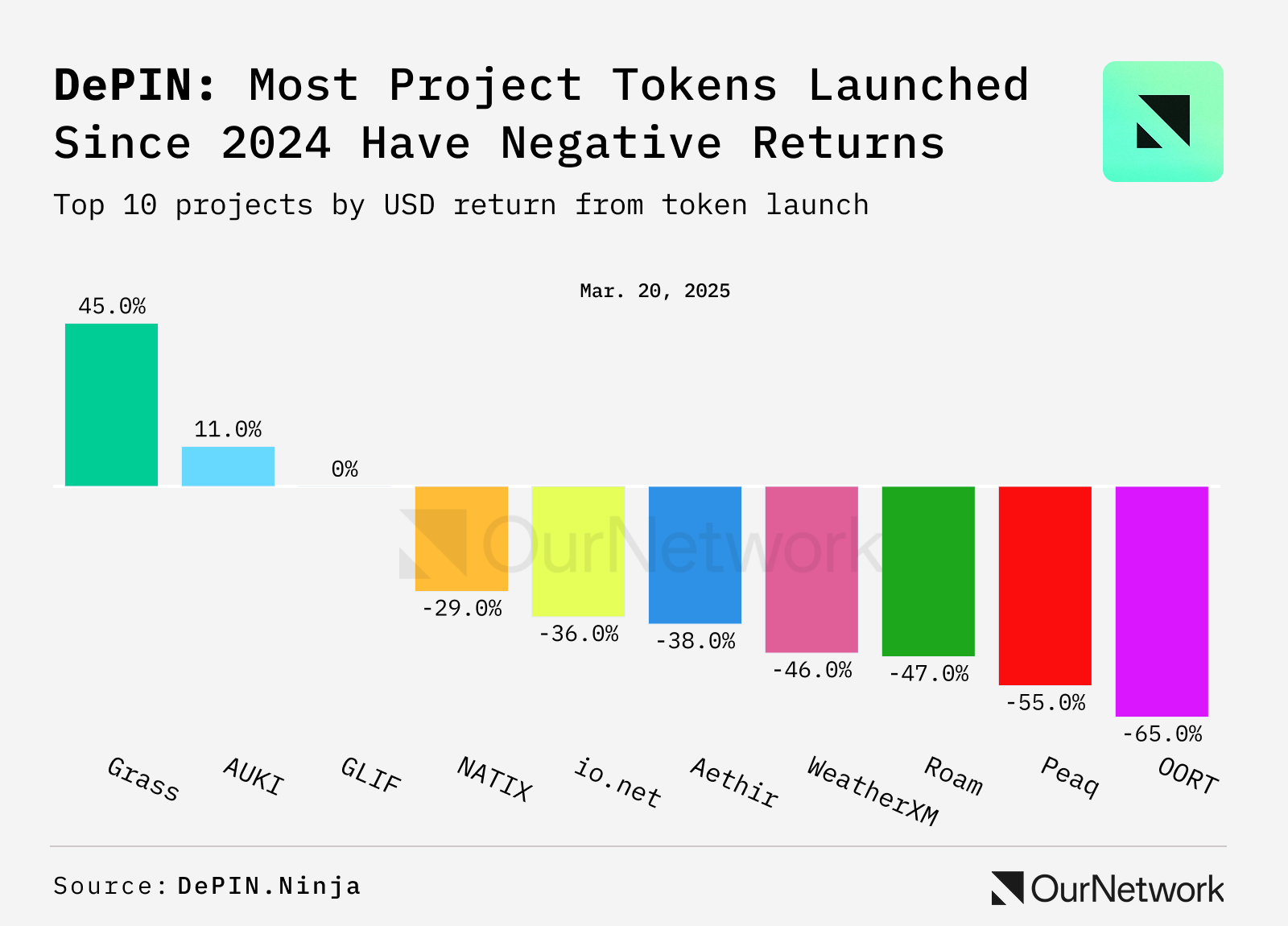 - An analysis of 20 DePIN token generation events (TGEs) in 2024 and 2025 year-to-date found that only the top 10% — 2 of 20 — are currently trading above the TGE price. Half the group has actually had the token price decline by over 50% since TGE. A third — 7 of 20 — are trading at below $30M fully diluted value (FDV), almost certainly below VC round valuations. The two DePINs whose price is up from the TGE, Grass and Auki, have not yet disclosed onchain revenue statistics.