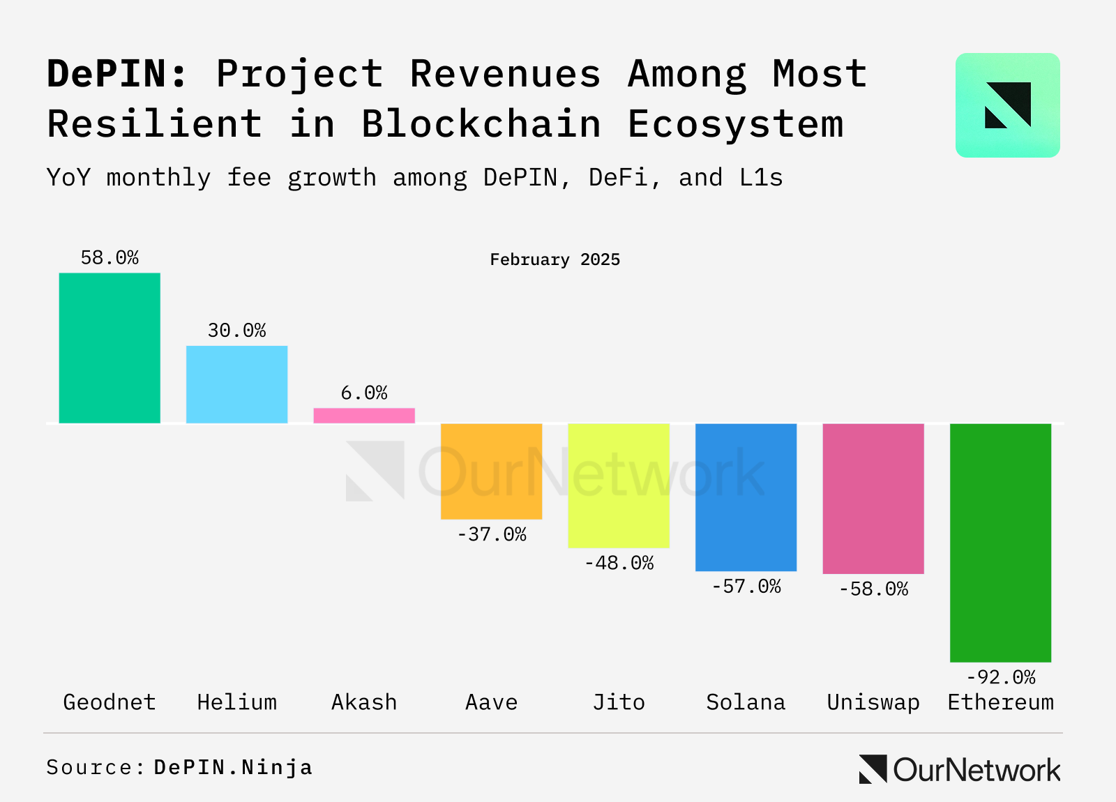 - The top revenue-generating projects are proving that DePIN onchain revenues are more resilient than the rest of crypto. GEODNET, Helium and Akash have all already grown revenues significantly from their monthly 2024 peak, while Layer 1s and DeFi revenues are down -50% or more on average from their monthly 2024 peak.