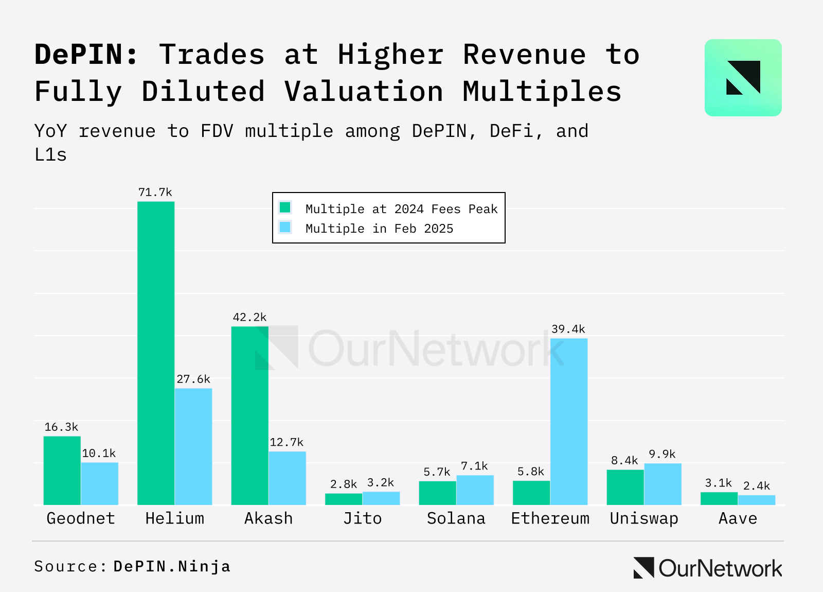 - Yes, DePIN multiples are higher than the rest of crypto, but that doesn't tell the whole story — DePINs grow into their higher revenue multiples during bear markets. Crucially, Layer 1s and DeFi shrunk out of their lower multiples in bear markets, as onchain activity & revenues fall even faster than prices.
