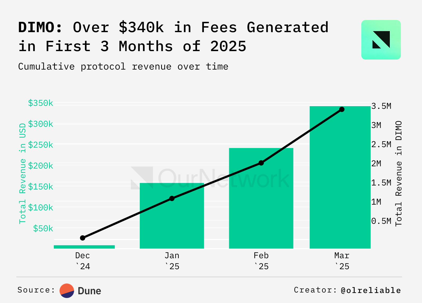- DIMO is an open connected vehicle platform that gives drivers insight into car health & driving habits, while rewarding users with DIMO tokens. Rewards are used on auto services like insurance, maintenance, or repairs. 170k+ vehicles have connected with 78k+ unique drivers. Onchain protocol revenue is generated from transaction fees and when developers access vehicle data using APIs. In 2025 alone, over 3m $DIMO in cumulative protocol fees have been generated, totaling over $340,000 in USD.