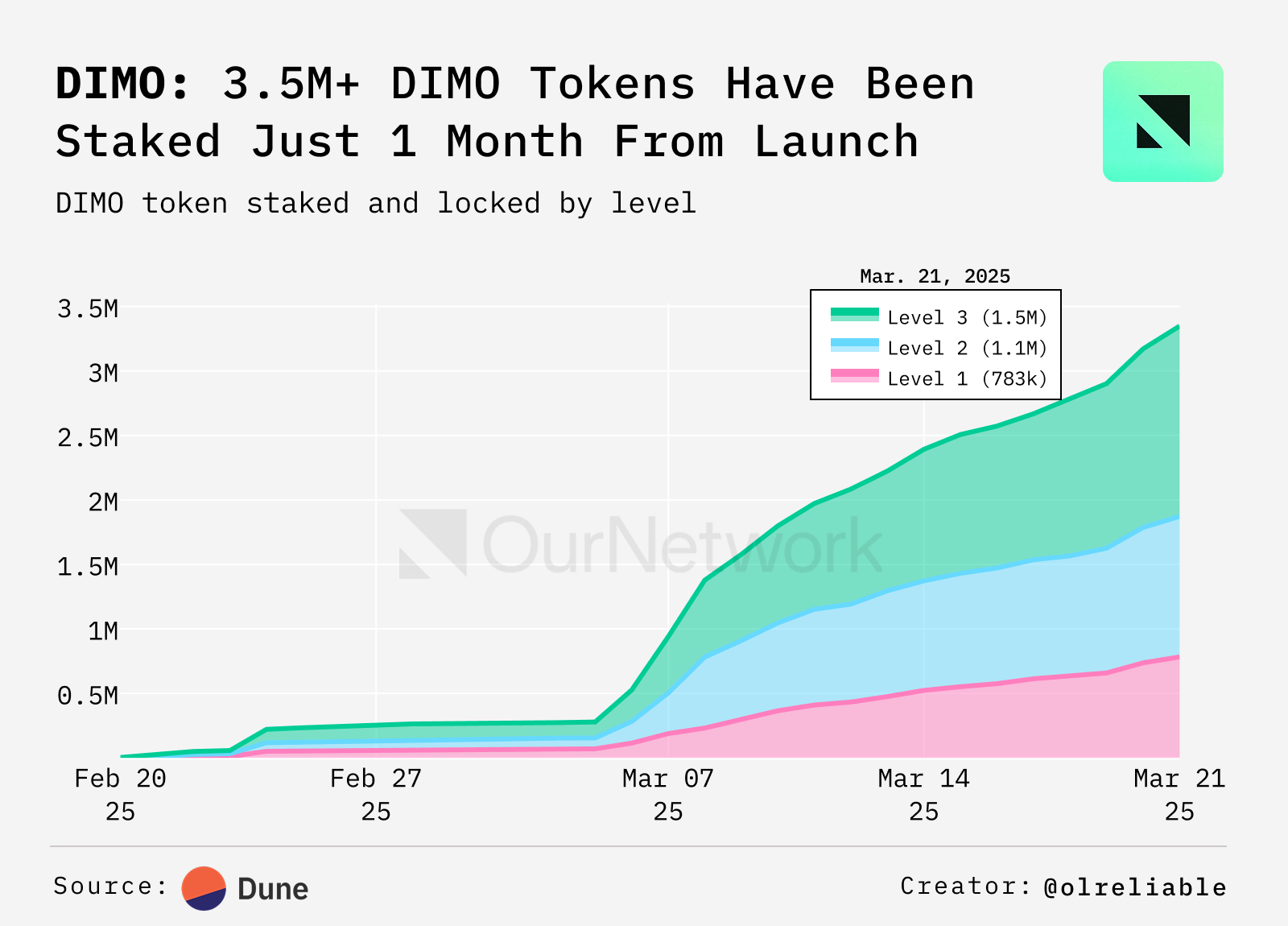 - In February, DIMO launched staking as a way for users to boost weekly rewards. There are three staking levels, each increasing in the amount of tokens and lock duration. In one month, 3.3M+ DIMO have been staked, with the largest group being the maximum stake of 4,000 $DIMO with a lock duration of two years.