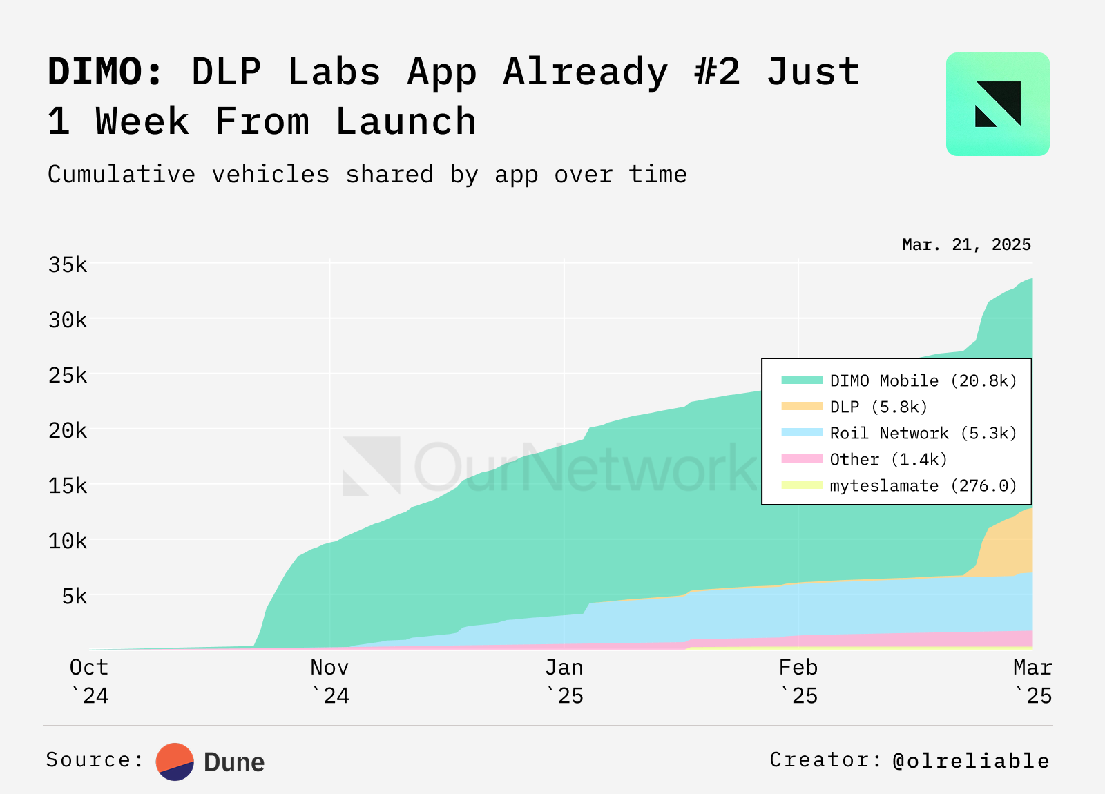 - To use apps in the DIMO marketplace, users must share vehicle data with the specific onchain developer license of that service provider. Last week, DIMO partnered with DLP Labs and the platform has over 5,800 vehicles shared already, rising to the #2 app on the network behind the DIMO mobile app.