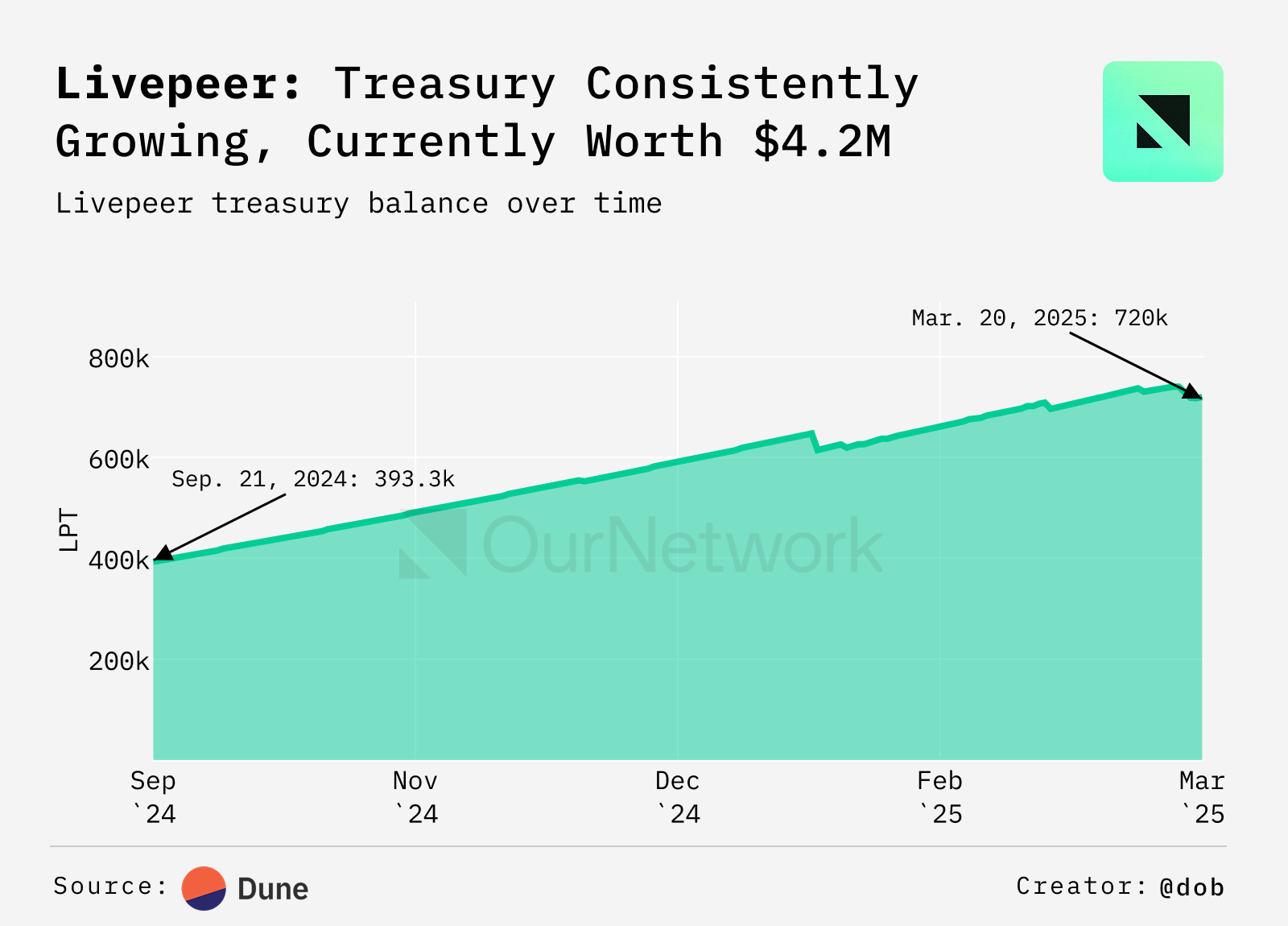 - The treasury's LPT balance has been growing steadily in the last three months while funding different proposals and Special Purpose Entities. On Dec. 14, it hit an all-time high accumulating 740,388 LPT tokens, enabling Livepeer to increase future public goods fundings to further the network’s expansion.