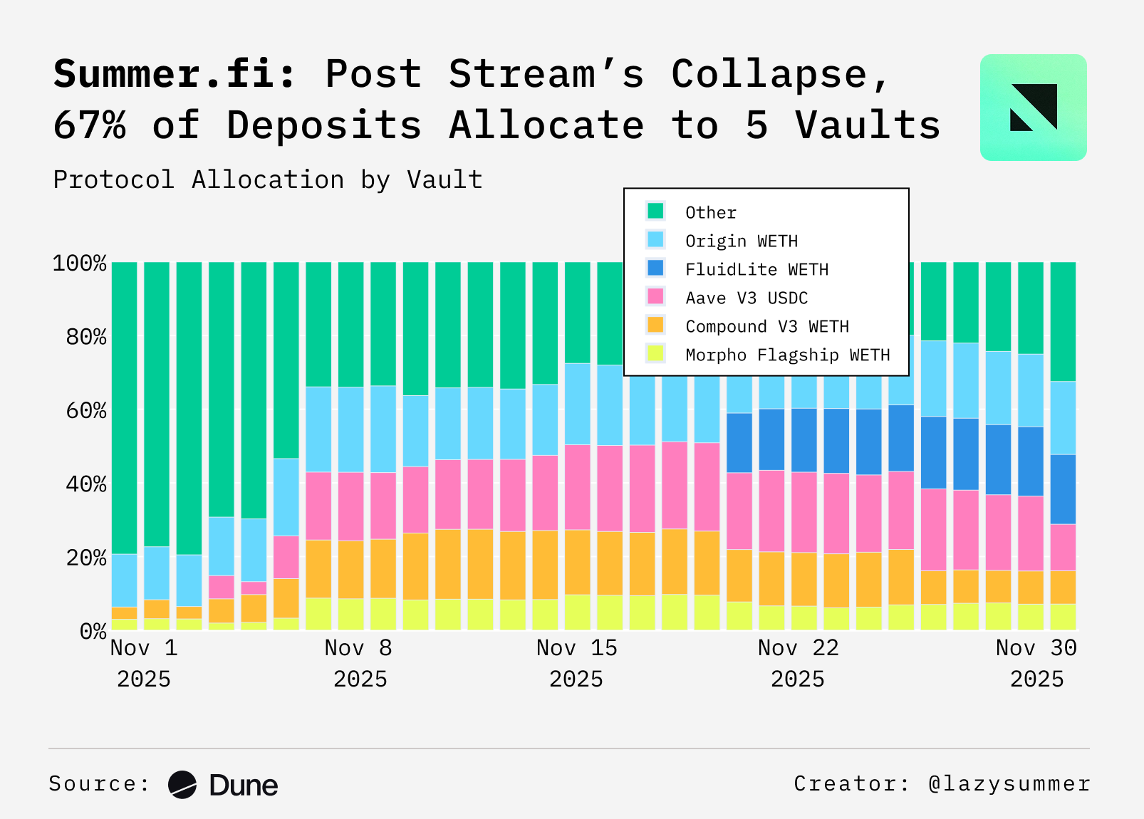 - November highlights Lazy Summer's risk-on/risk-off nature. Users access top DeFi yields when risk/reward favors it, reverting to safety when it doesn't. The chart shows automated rebalancing in action, moving from risk-on positions to concentrated bluechip strategies after Stream Finance's collapse.