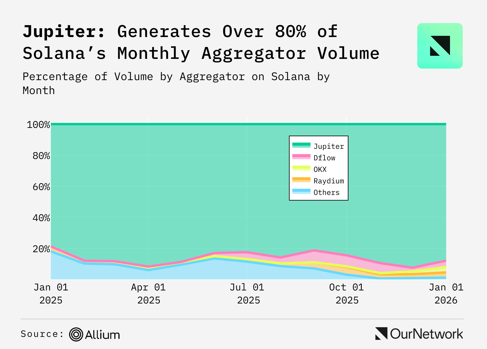 - In 2025, Jupiter grew into the backbone of stablecoin DEX aggregation, processing $461B in volume. Momentum peaked in December with a record $70B month. Average stablecoin monthly volume reached $36B, growing ~6% month-over-month, as Jupiter captured over 90% of the market.