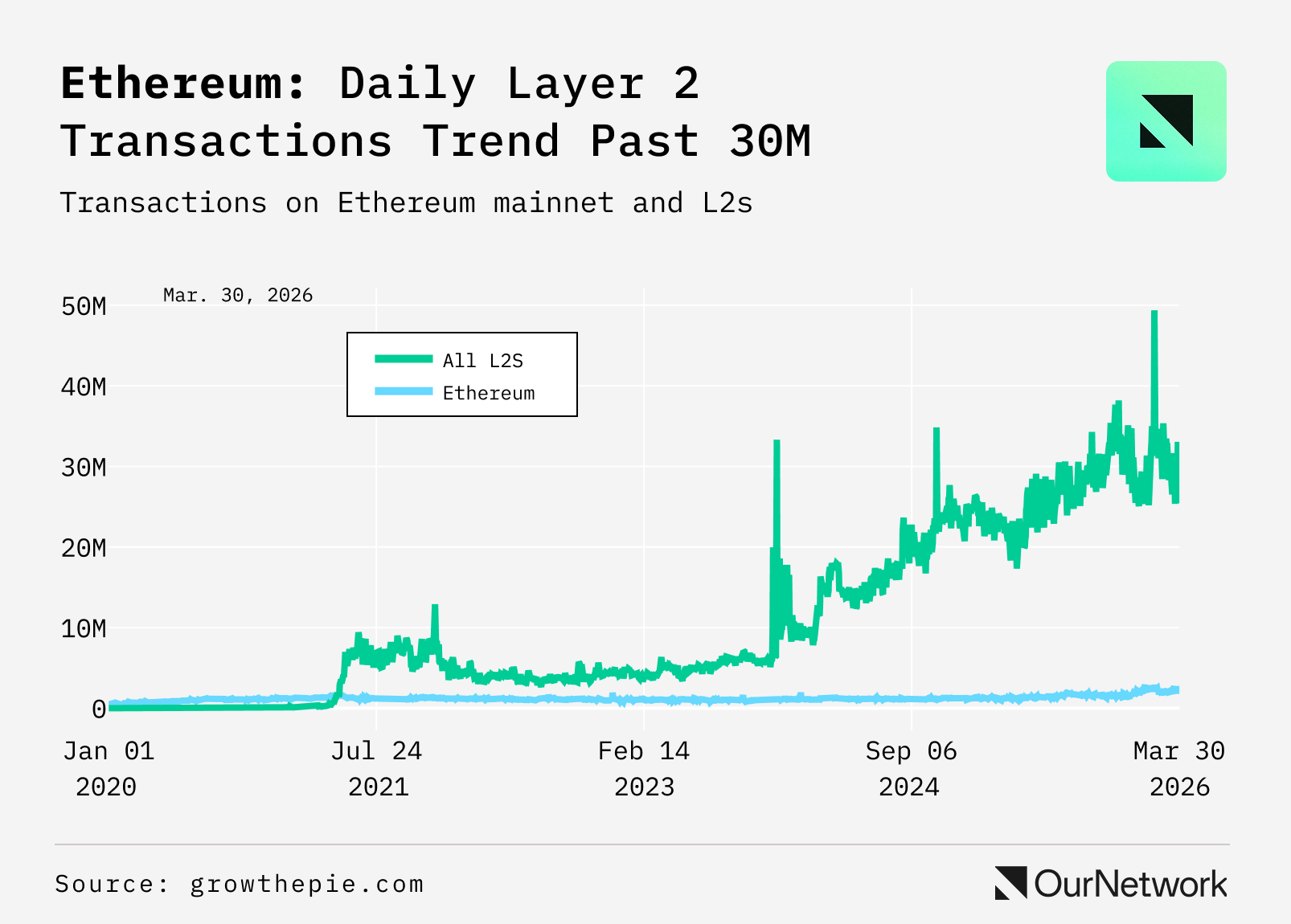 - Ethereum is the dominant Layer 1 in crypto, accounting for 53.9% of all total value locked as of April 2026 and serving as the settlement layer for the majority of onchain stablecoin supply. A defining dynamic of its ecosystem is its Layer 2s — chains that execute transactions off Ethereum before settling them permanently back on mainnet. As of March 30, 2026, L2s process roughly 25-30M daily transactions per growthepie against mainnet’s ~2-3M, a gap of roughly 10x that has widened every year since mid-2021.