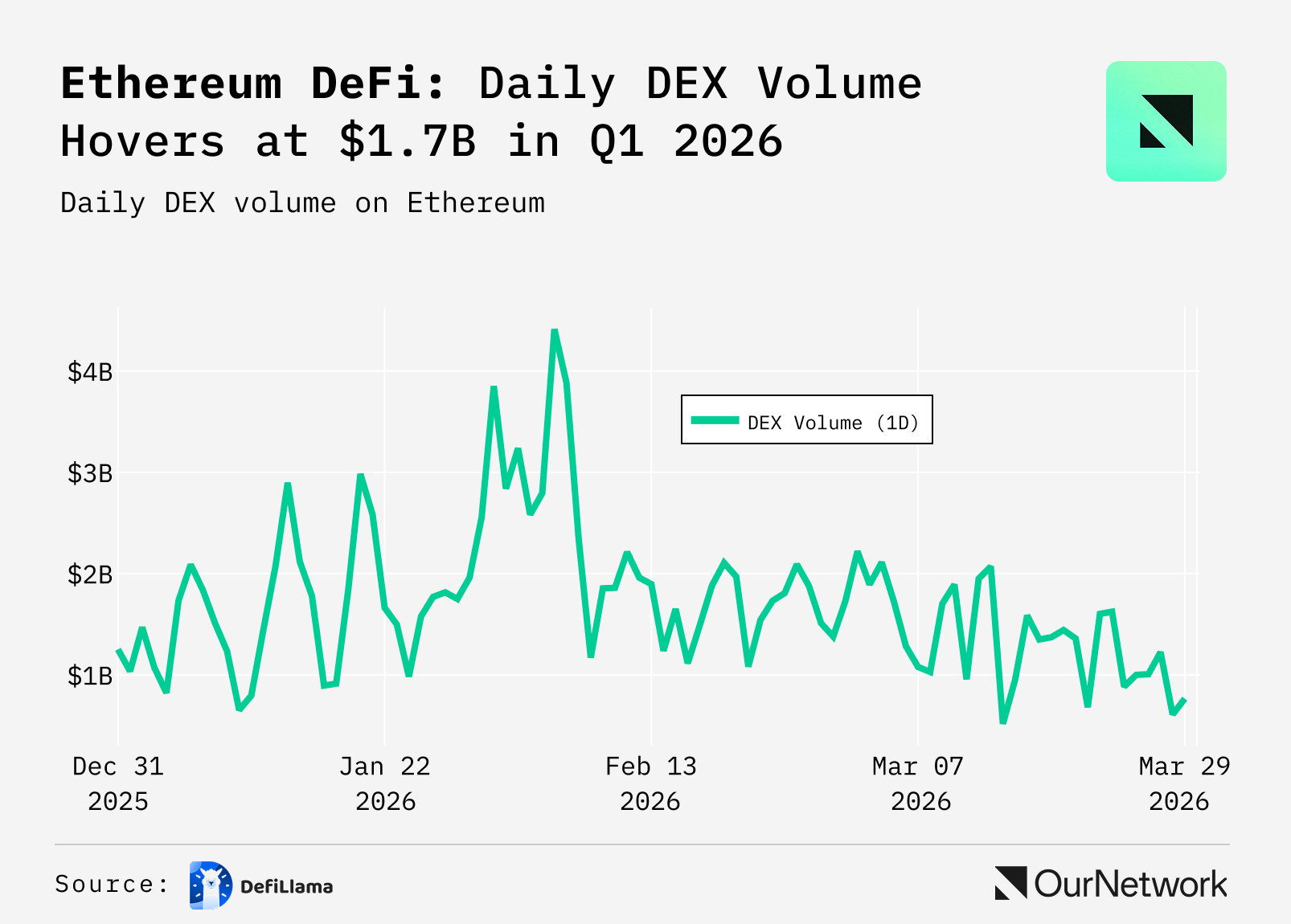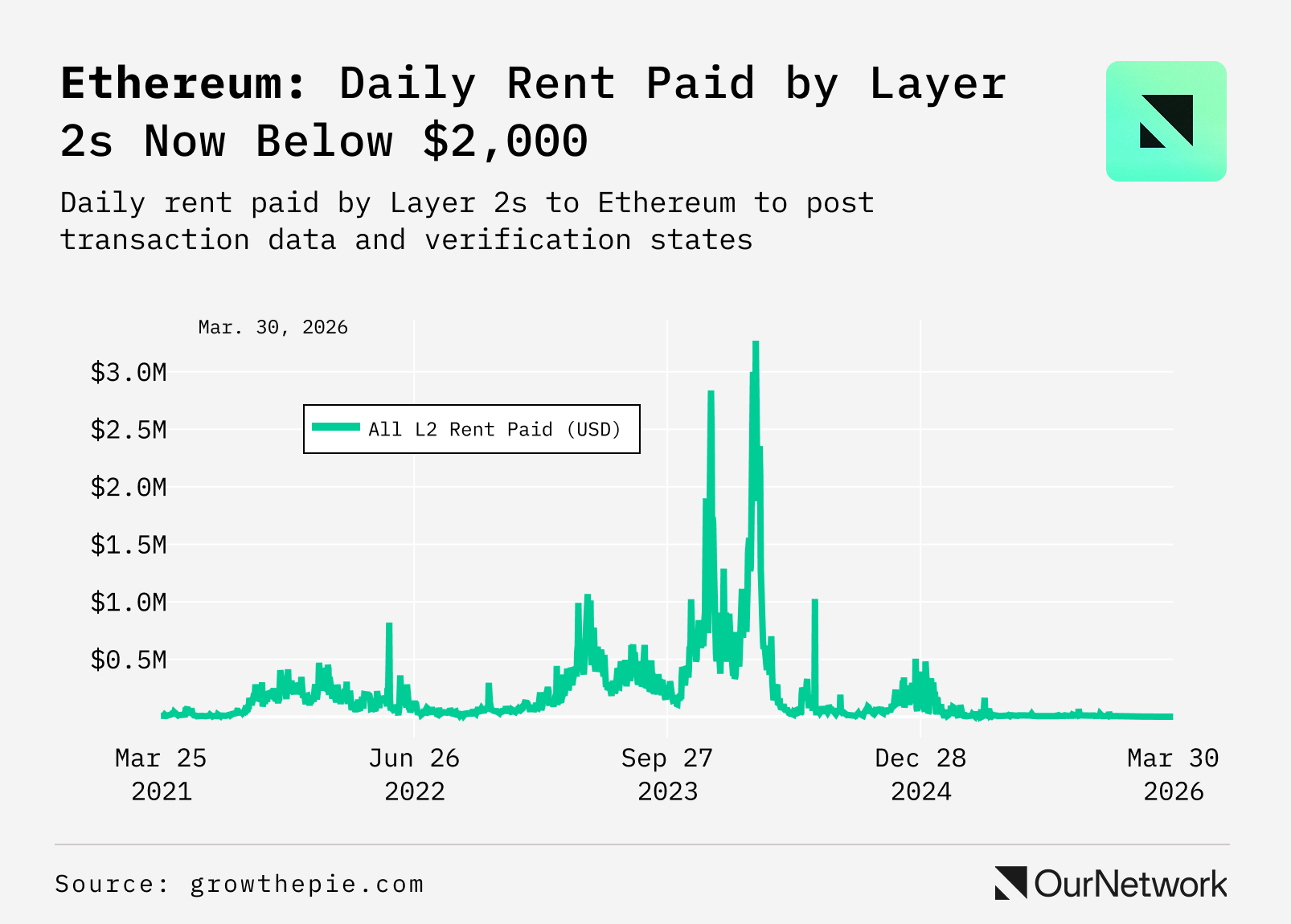 - Notably, while L2 transaction count has continued to grow, the fees those scaling solutions pay to Ethereum’s mainnet have not. This is due in large part to a 2024 upgrade called Dencun, which created a market designed specifically for L2s to post data to Ethereum. This dropped costs for L2s using Ethereum’s base layer as an anchor chain, but also lowered the chain’s revenue from scaling solutions — from a late-2023 peak of approximately $3.0M in daily rent paid to below $2,000 per day by March 30, 2026, a decline of over 99% per growthepie. On its face, this significant short-term drop in revenue appears to be a negative development for the network, but lower settlement costs have transformed Ethereum into a far more viable foundation for L2s long-term.