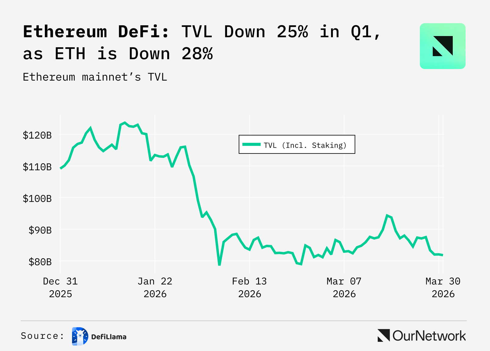 📈 Ethereum DeFi TVL crashed -36.5% in Q1 and came back structurally intact, supported by lending and liquid staking