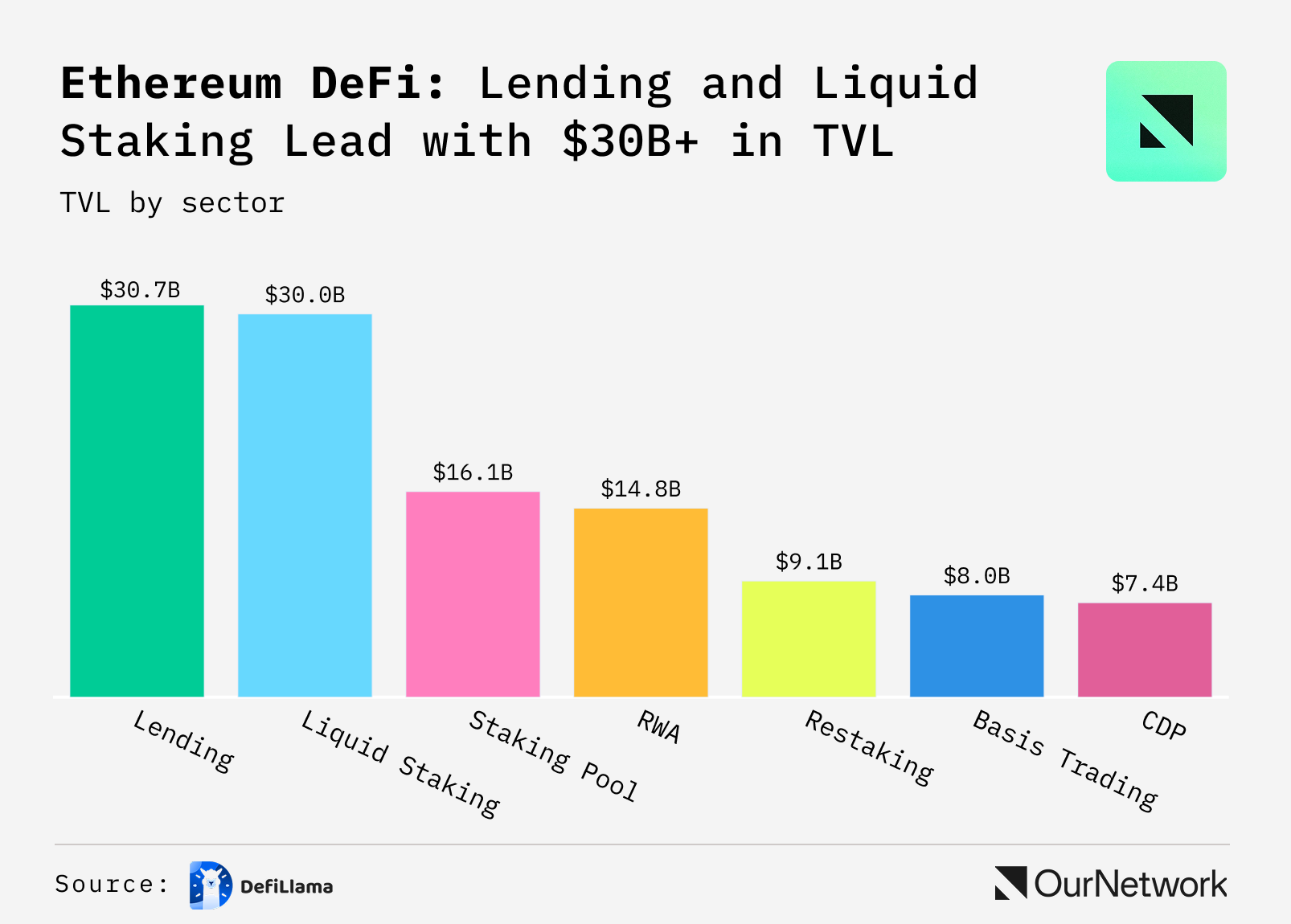 - At $30.7B and $30.0B respectively, lending and liquid staking, are virtually tied as Ethereum's two dominant DeFi categories, separated by just $700M. Together they represent the structural floor of Ethereum DeFi. Behind them, RWA, at $14.8B, and restaking, $9.1B, have grown to $24B combined.