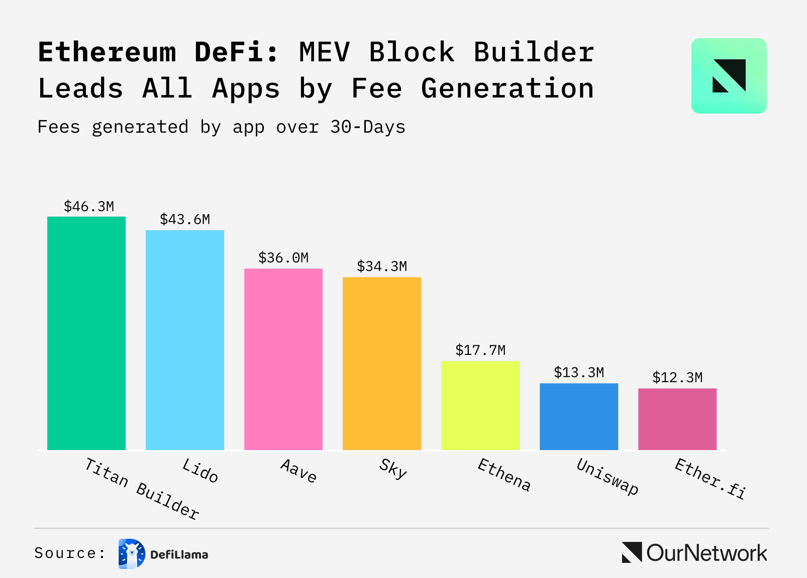 - Surprisingly, the number one fee earner on Ethereum isn't a household DeFi protocol like Aave, Lido, or Uniswap. It's actually Titan Builder, an MEV block builder: $46.3M in fees, up 105% month-over-month, at 85.6% margin. Among user-facing apps, Uniswap dominates spot DEX at $19.9B in 30-day volume while Sky leads on revenue efficiency at 44% margin versus Aave's 13.9%.
