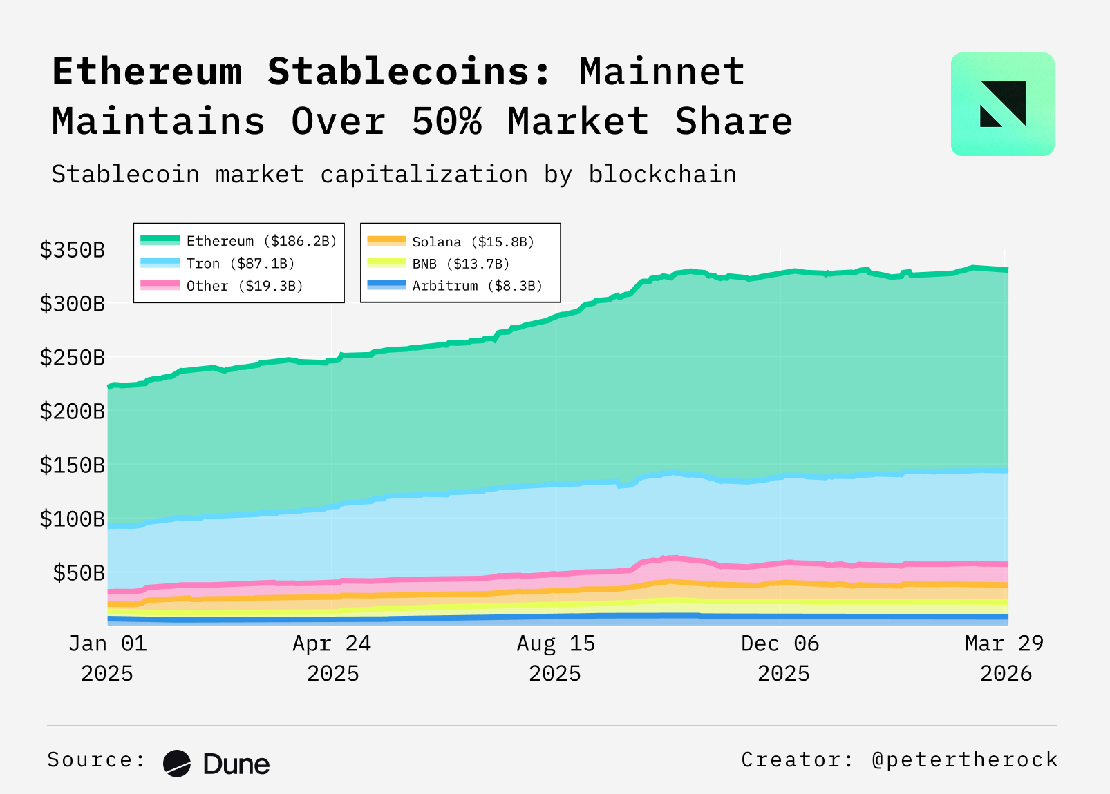 - Ethereum's USD-based stablecoin supply has grown from $130B at the start of 2025 to about $186B today, marking about 45% in year over year growth. Ethereum remains the primary settlement layer for stablecoins, accounting for ~56% of total USD-based stablecoin supply across chains despite rising competition from other networks.
