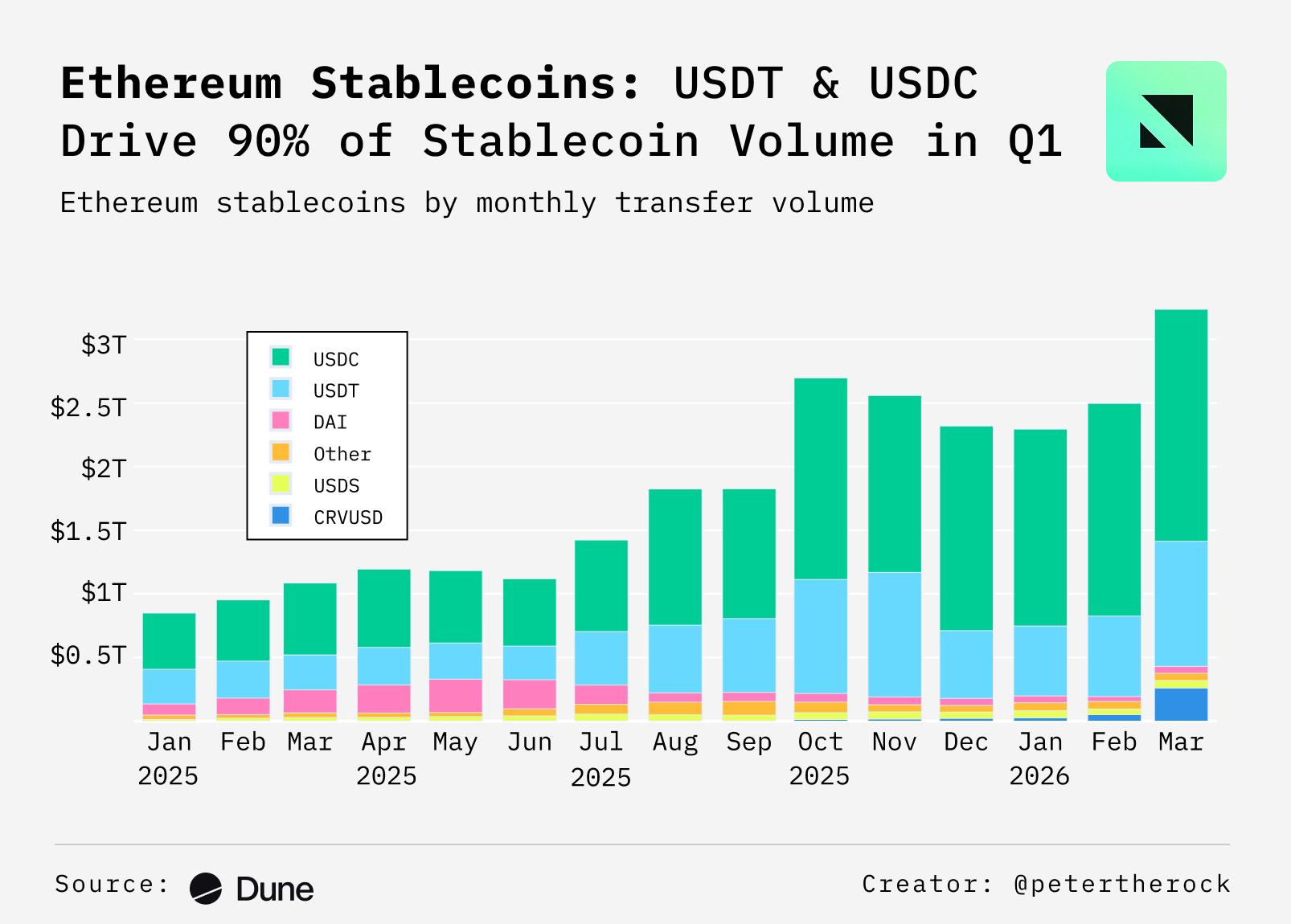 - In March, Ethereum's USD stablecoin activity surged 30% month over month to hit an all-time high. USDC and USDT, which together account for 86.7% of volume, have been driving the growth, reinforcing their dominance as the core settlement assets.