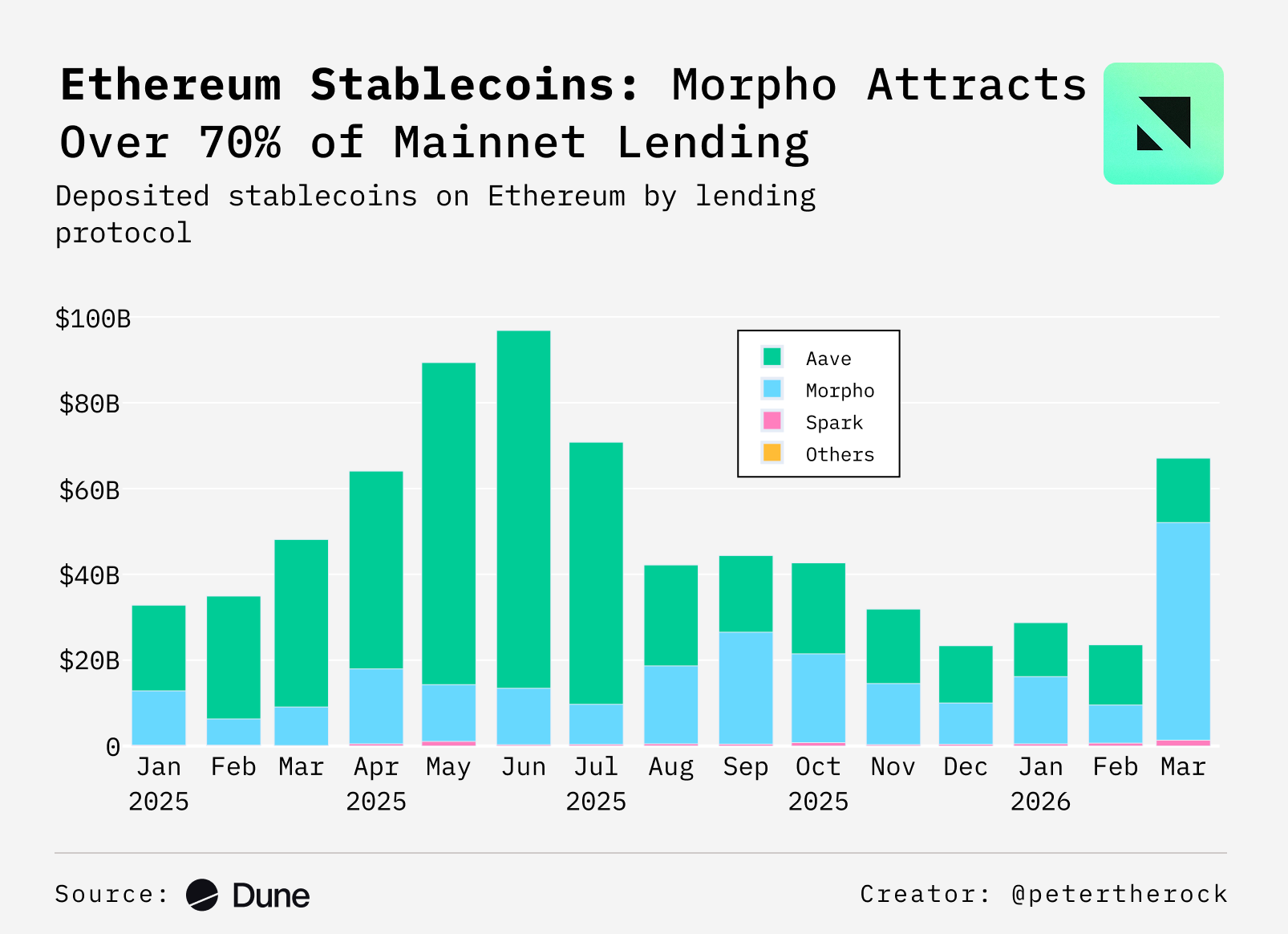 - On Ethereum, stablecoin lending supply volumes tripled month over month to $67B, marking a sharp surge in activity since mid-2025s. Morpho led the growth, accounting for ~75% of volumes, and has now overtaken Aave as the largest lending protocol on the network.