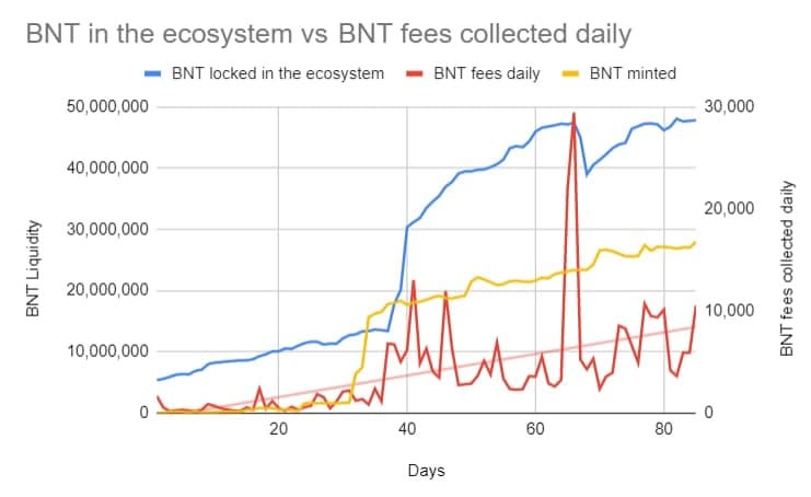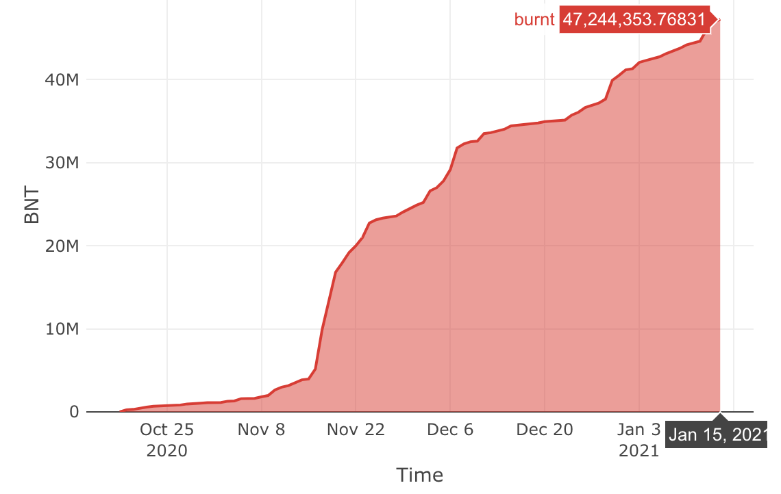 - The burning of protocol-invested BNT and its accrued fees occurs when a non-BNT liquidity provider withdraws their deposit, or when a BNT holder stakes their BNT in a pool. This creates deflationary pressure on BNT, with 47.2M BNT ($80.24M USD) burned since October 18. A perpetual burning mechanism, called the Bancor Vortex, has been proposed to burn fees from each swap instead of fee-burning only occurring with LP withdrawals/deposits. Source: Dune Analytics. A full report on Bancor v2.1 protocol health can be found here.