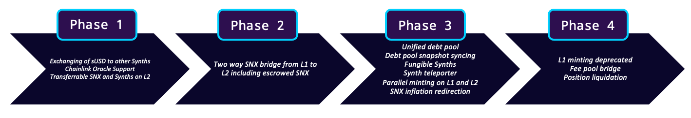 - Finally, most recently the protocol has been preparing for the migration to Optimistic Ethereum. While still subject to community approval, a four-phase transition plan has been defined. Some key points of the plan include (1) supporting exchanges on L1 AND L2, (2) moving minting to L2, and (3) fluid movement of synths between L1 and L2. Other alternatives include building an entire parallel version of the protocol on L2, however, this would impact the UX by fragmenting liquidity, siloed to their respective layers. For more in-depth details of the plan and its phases see here.
