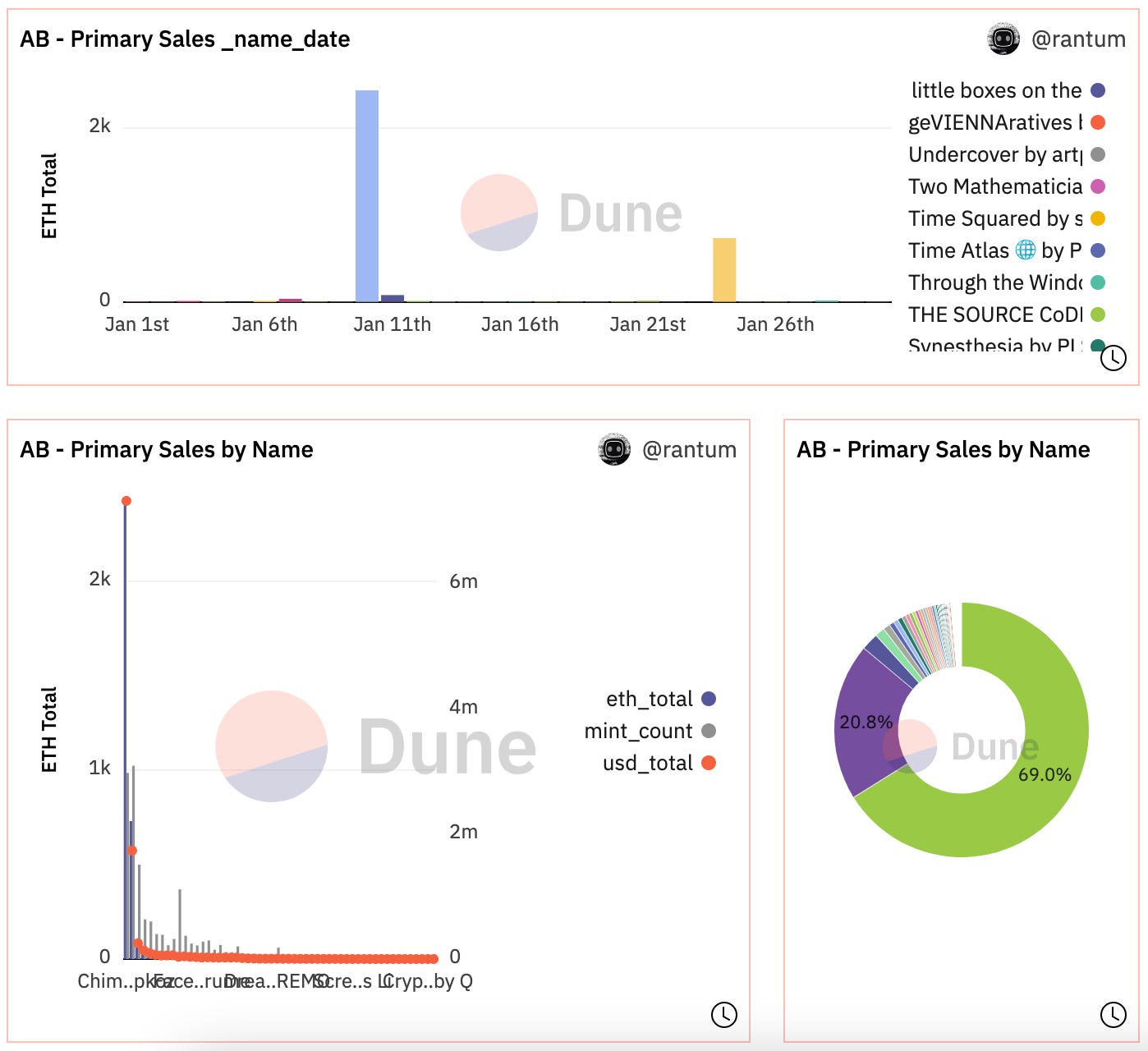 - Art Blocks saw over $3.1m (2,500 ETH) in primary mint sales past 30 days, driven primarily by the Running Moon collection from Lucia He, which accounted for 47% of volume (1,767 ETH). Sudfah and Montreal Friend, both part of ArtBlocks Curated Series 7, combined for ~420 ETH of primary sales.