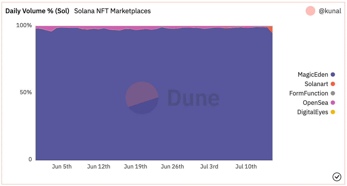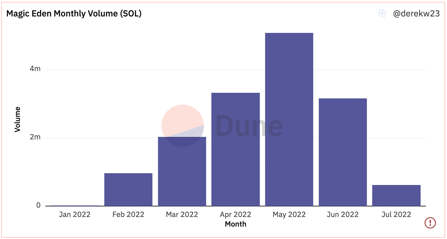 - Magic Eden is the leading NFT marketplace on Solana. The project recently crossed 400k YTD users, tracking at ~425k. Cumulative volume reached 21.6m SOL (~$821m). Over the past few months, it has defended its market share, currently tracking at ~99% of volume. Despite recent declines in volume, their user numbers remain strong: 10-15k DAU and ~120k MAU, down only slightly from May and April highs.