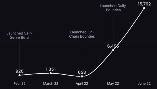 - Layer3 is a user acquisition platform to drive discovery, targeted conversions, and retention for platforms across EVM chains. Their modular bounty builder enables protocols to acquire & retain users effectively and efficiently – a web3-native ads manager. They launched the feature in April and recently eclipsed over 350,000 conversions by over 15,700 monthly active users across products such as 1inch, Slingshot, Aave, Uniswap and more.