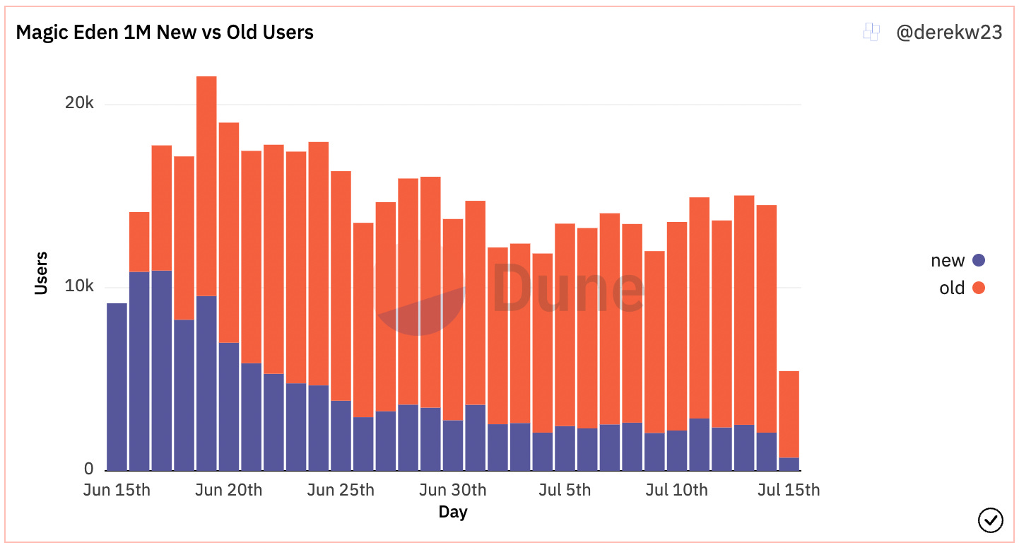 - Magic Eden’s retention is quite strong: ~6/7th of their current DAU are returning customers from earlier in the month. The average number of transactions per DAU further supports that the marketplace is beloved by its users, suggesting users purchase ~4 NFTs every day they visit the site.