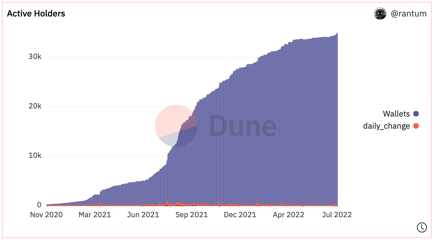 - Nearly 35k unique wallets hold an ArtBlocks piece, and the number has rarely gone down. Over the past month, there's been an increase of roughly 500 wallets, after a relatively flat period from April through mid-June.