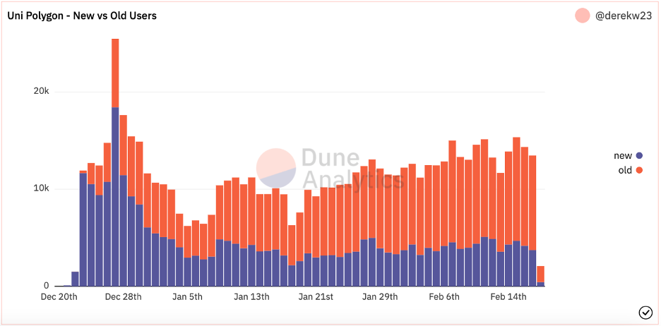 - Uniswap’s users on Polygon appear relatively sticky. About 70% of daily users over the past few weeks have traded on the platform at least once. This behavior is relatively similar to users on Ethereum, where ~75% of daily users were returners over a similar period.