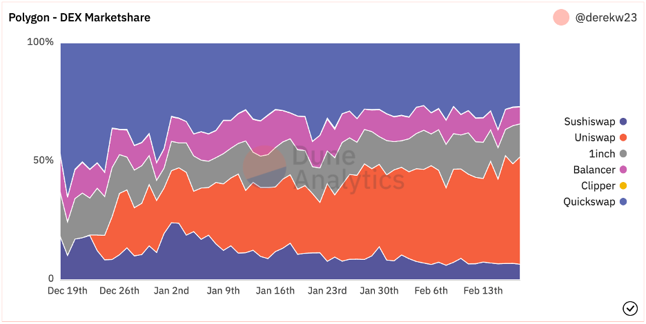 - Uniswap deployed on Polygon in late December of 2021. Since then, the project has rapidly gained market share. Within a week, Uniswap captured 20-25%; after two weeks, closer to ~30%, taking significant volume from QuickSwap and Sushiswap. This uptick is despite Uniswap having ~11% and ~18% of the token options on QuickSwap and Sushiswap, respectively. The project’s current market share is about 45% on Polygon. For reference, it’s tracking around 75% on Ethereum.